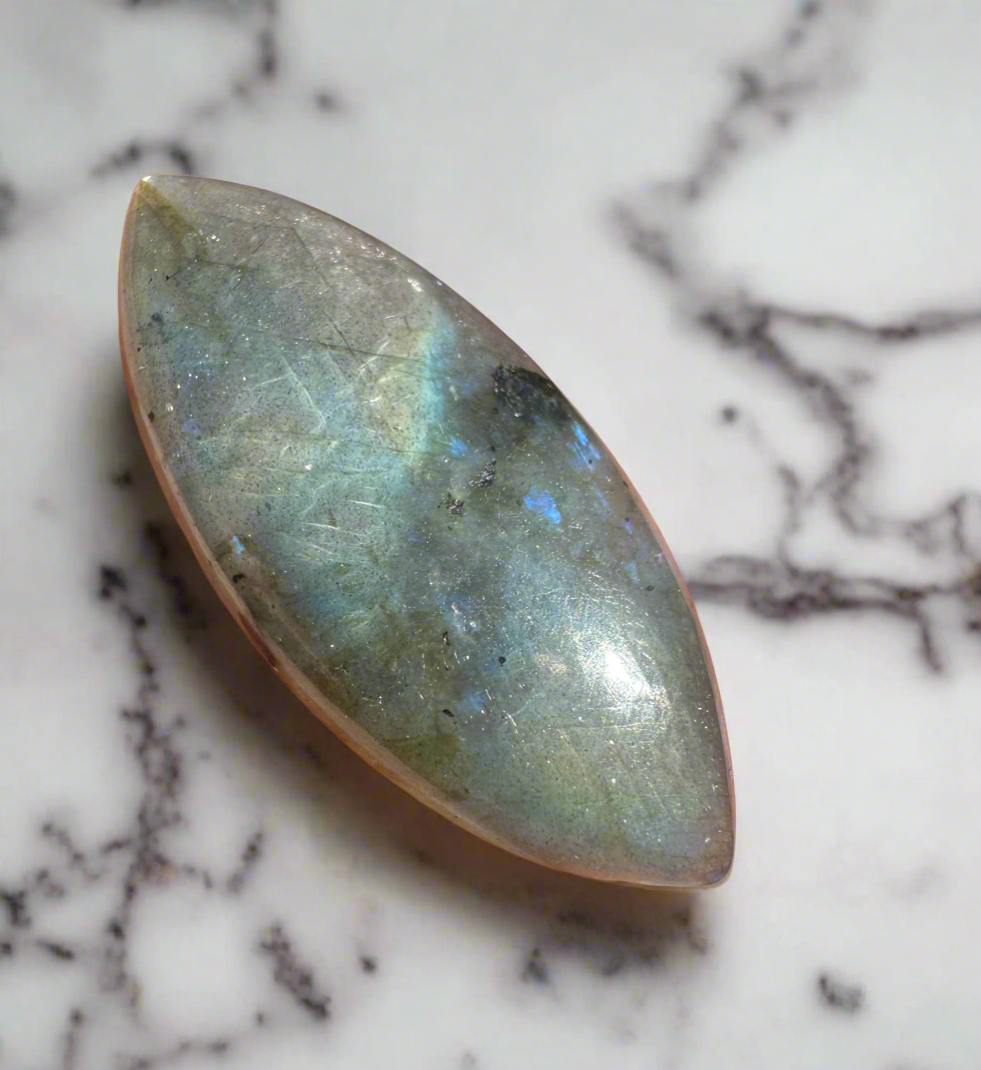 Make a statement with our Marquise Labradorite Cabochon 75a. The unique marquise shape and iridescent labradorite stone make for a bold and eye-catching addition to any jewelry design. Add a touch of magic and shine to your creations with this cabochon.