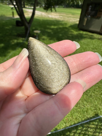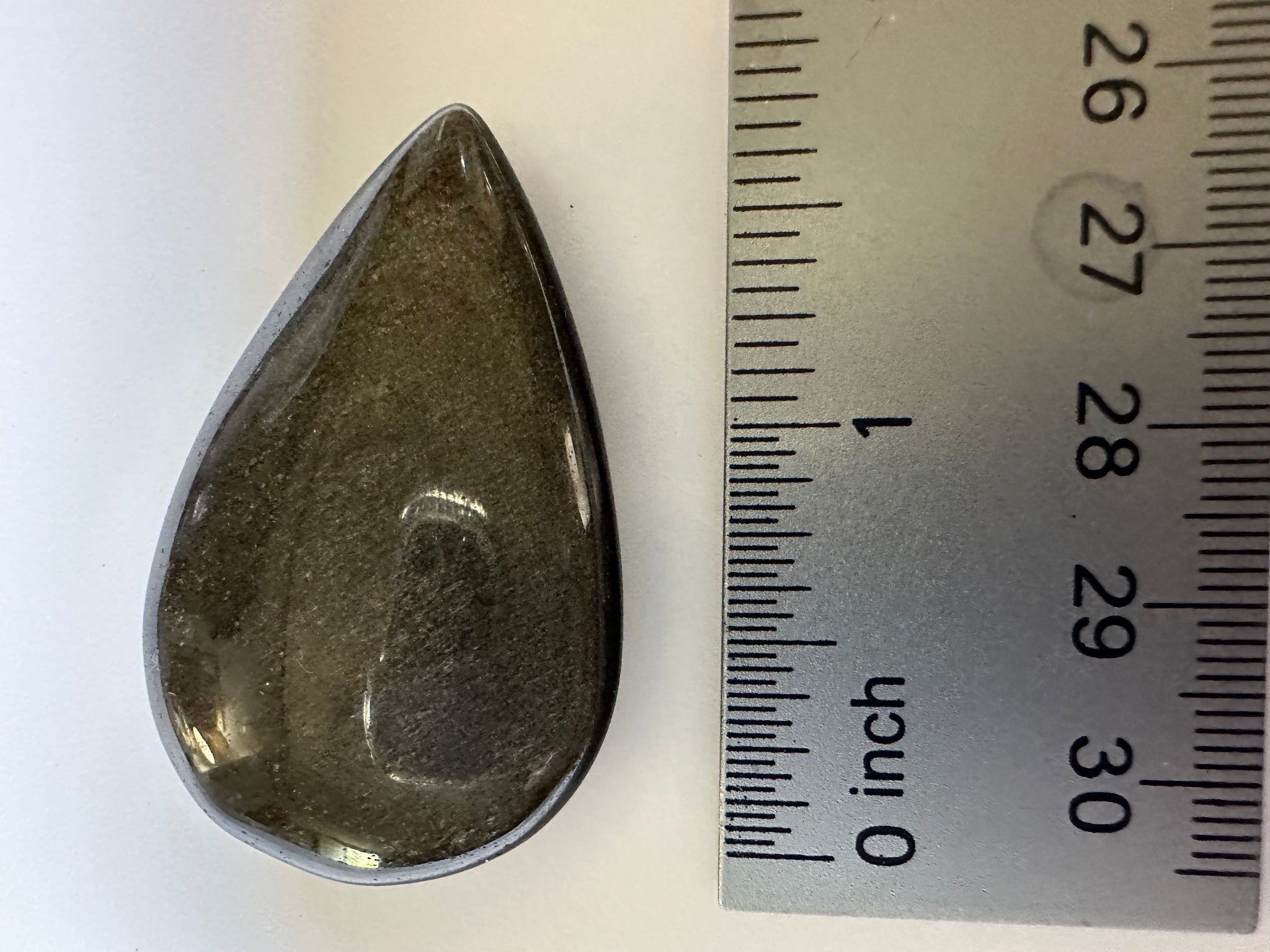 Discover the captivating beauty of this Natural Gold Obsidian Pearshape Large Cabochon #6. Its unique golden flecks shimmer against the deep black stone, making it a striking centerpiece for jewelry or collection. Perfectly shaped and polished, this cabochon offers both elegance and natural charm, ideal for those seeking a distinctive and luxurious touch. Elevate your creations or collection with this rare and mesmerizing gem. Stand not included.