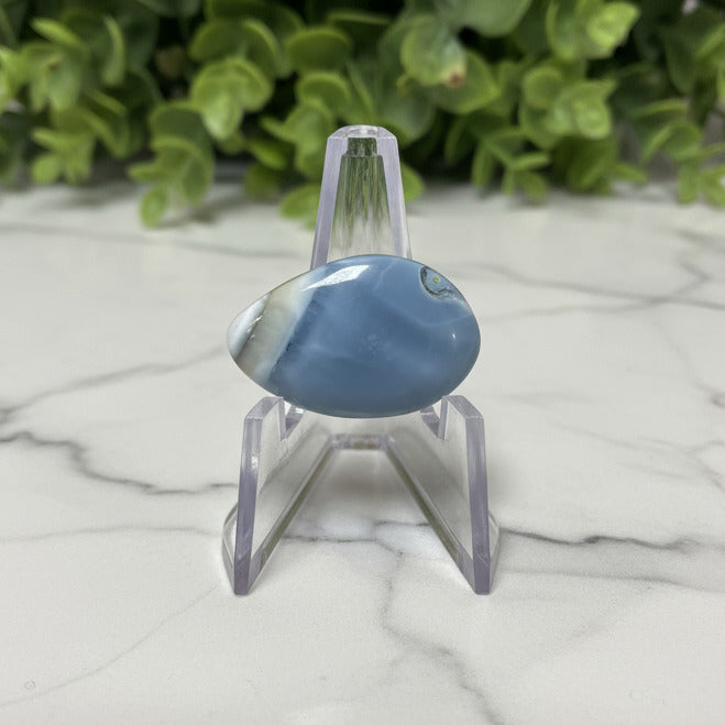 Discover the captivating beauty of the Owyhee Blue Opal Cabochon, showcasing a mesmerizing play of blues and subtle opalescence. Handcrafted for smooth elegance, this cabochon is perfect for creating striking, one-of-a-kind jewelry. Its unique color and polished finish bring a touch of natural wonder to any collection, making it an irresistible addition for enthusiasts and artisans alike. Elevate your designs with this exquisite stone and experience the timeless charm of Owyhee Blue Opal. Stand not included,