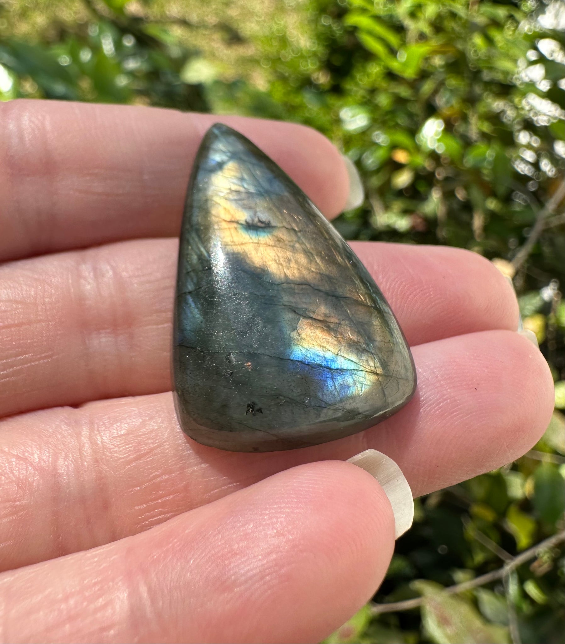 Get a unique piece of jewelry with this Triangle Labradorite Cabochon 78a! This cabochon features a mesmerizing triangle shape and a stunning labradorite stone. Add a touch of playfulness to your outfit while showcasing the natural beauty of labradorite. Only confident in asserting its one-of-a-kind appeal!