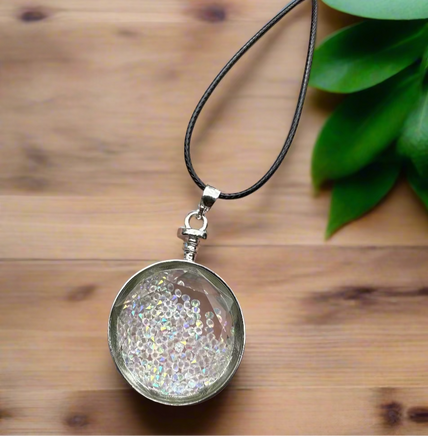 This elegant glass pendant showcases mesmerizing Aurora Borealis pieces that gently move within, capturing light from every angle. Its unique design adds a dynamic sparkle to any outfit, perfect for those who appreciate subtle yet captivating jewelry. Lightweight and eye-catching, it’s an effortless way to elevate your style with a touch of magic.