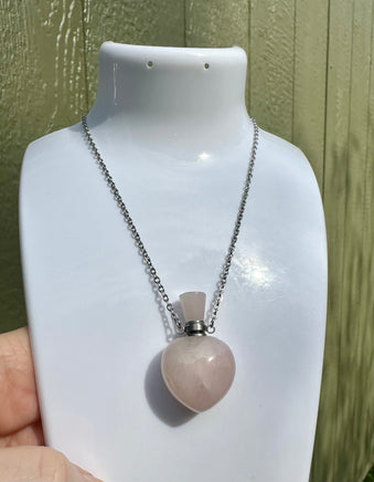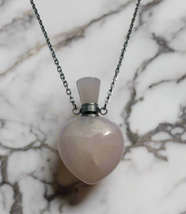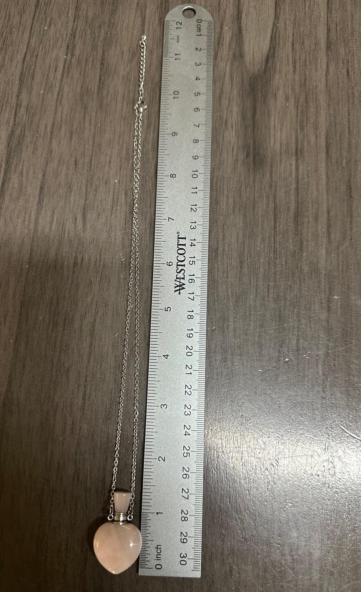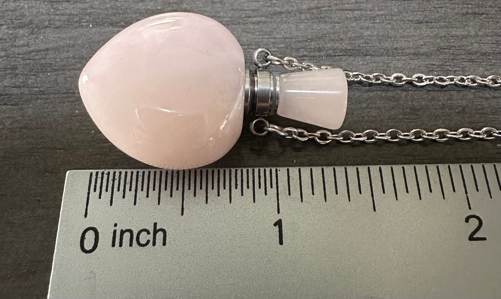 This elegant Rose Quartz Heart Shape Perfume/Essential Oil Bottle Necklace lets you carry your favorite fragrance or essential oil with you throughout the day. The heart shape and natural properties of rose quartz enhance feelings of love and self-care. Stay refreshed and centered with this beautiful and practical accessory. Silvetone necklace.