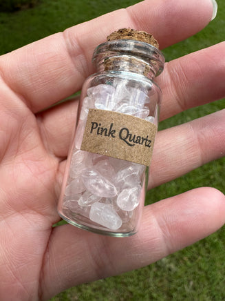 Enhance your space with the soothing energy of Pink Quartz chips, elegantly contained in a charming bottle. Perfect for decor or mindful practices, these chips promote calm, love, and positive vibes wherever displayed. Their natural blush tones add a delicate touch, making this bottle both a beautiful keepsake and a source of gentle balance.