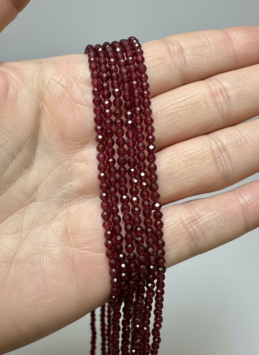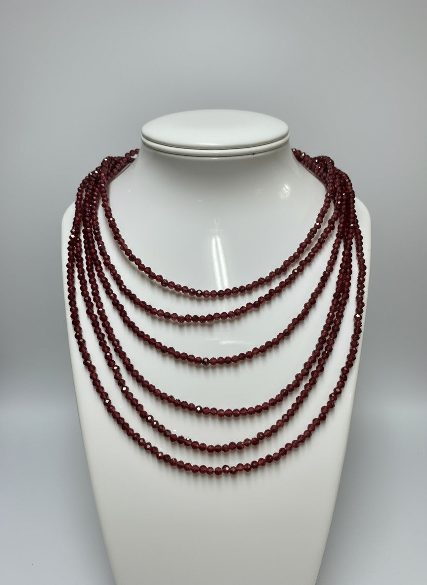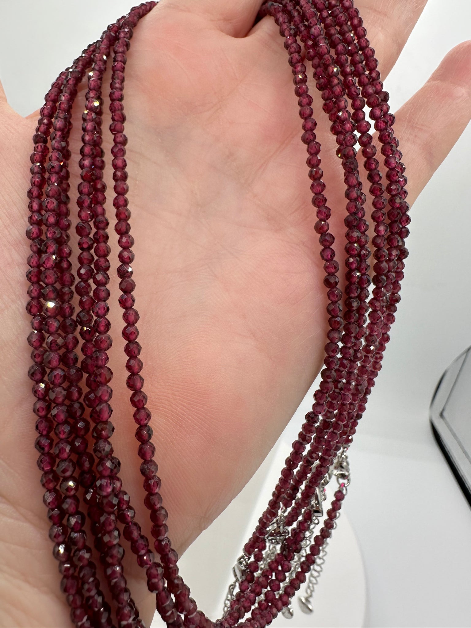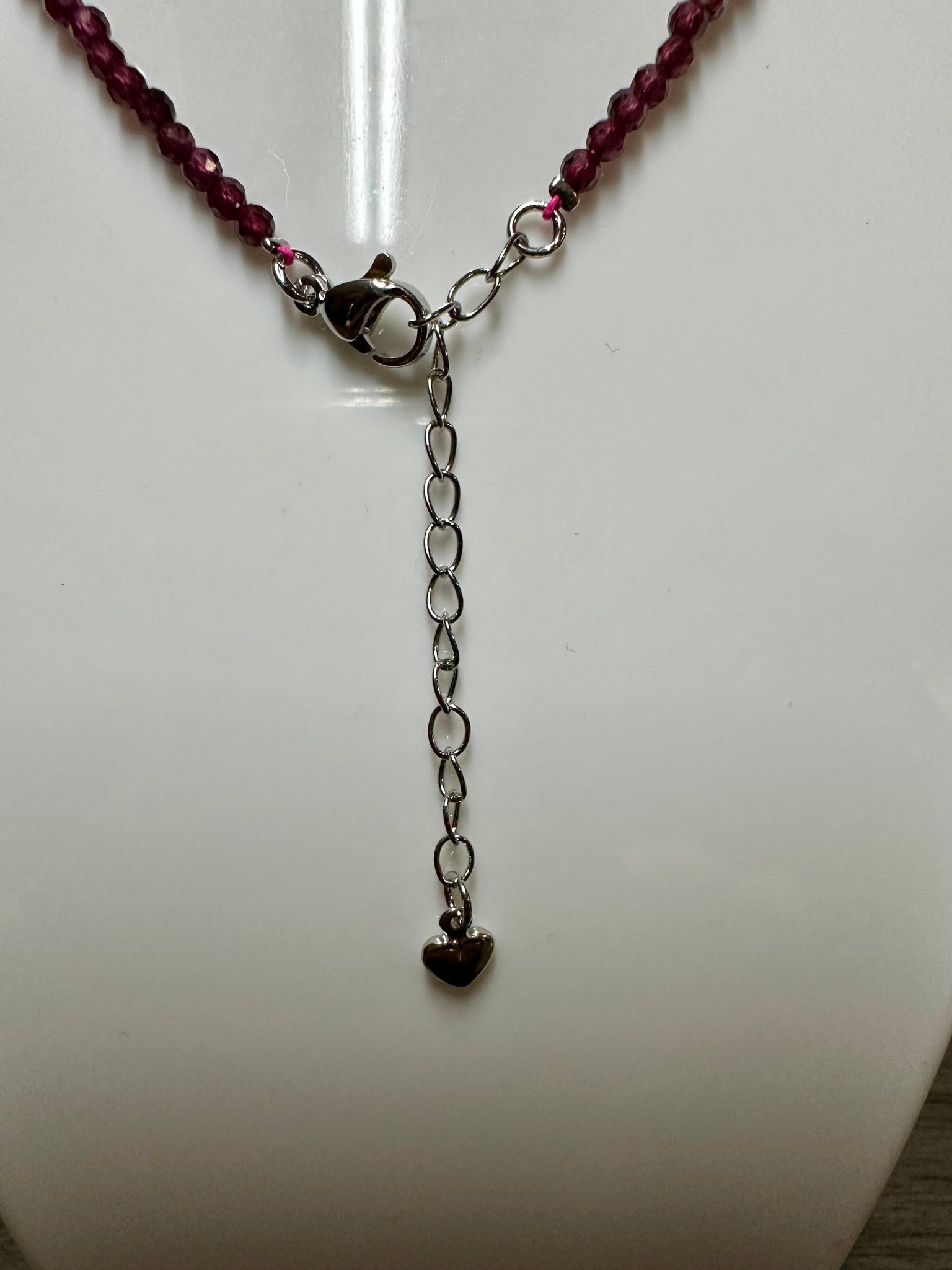 Expertly crafted with natural 3mm faceted garnet beads, this necklace offers a touch of elegance to any outfit. The faceted design adds a sparkling touch, while the natural garnet provides potential benefits such as increased vitality and strength. A perfect addition to your jewelry collection. Necklace length 16” plus 2” extension. Clasp and extensions are made with Stainless Steel.