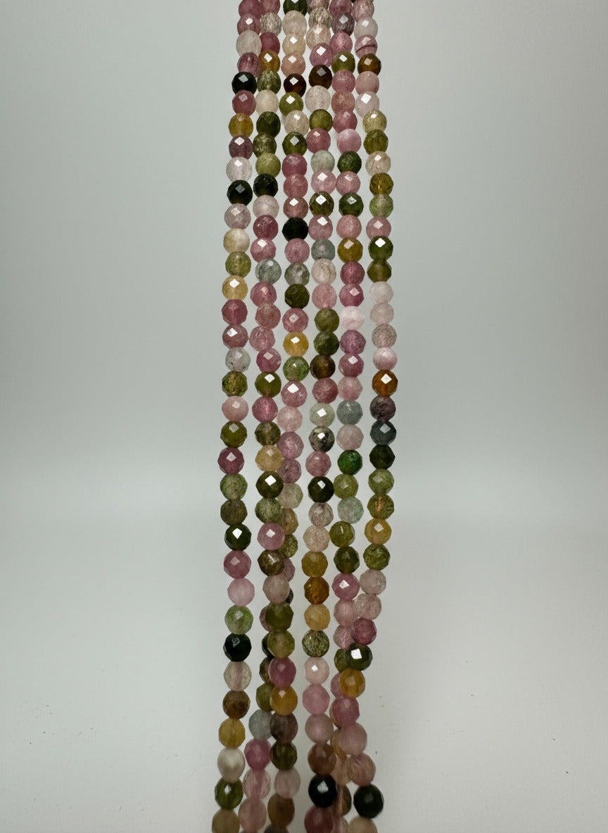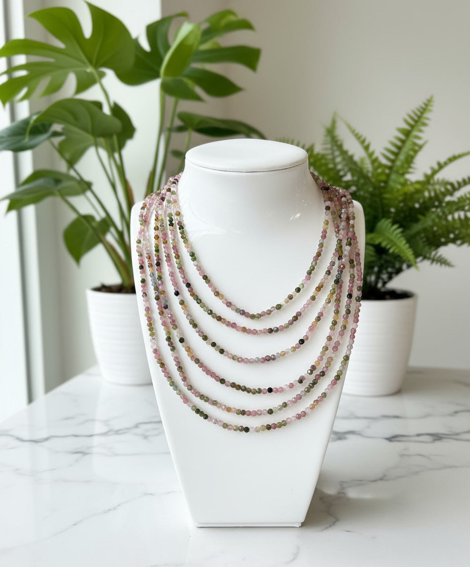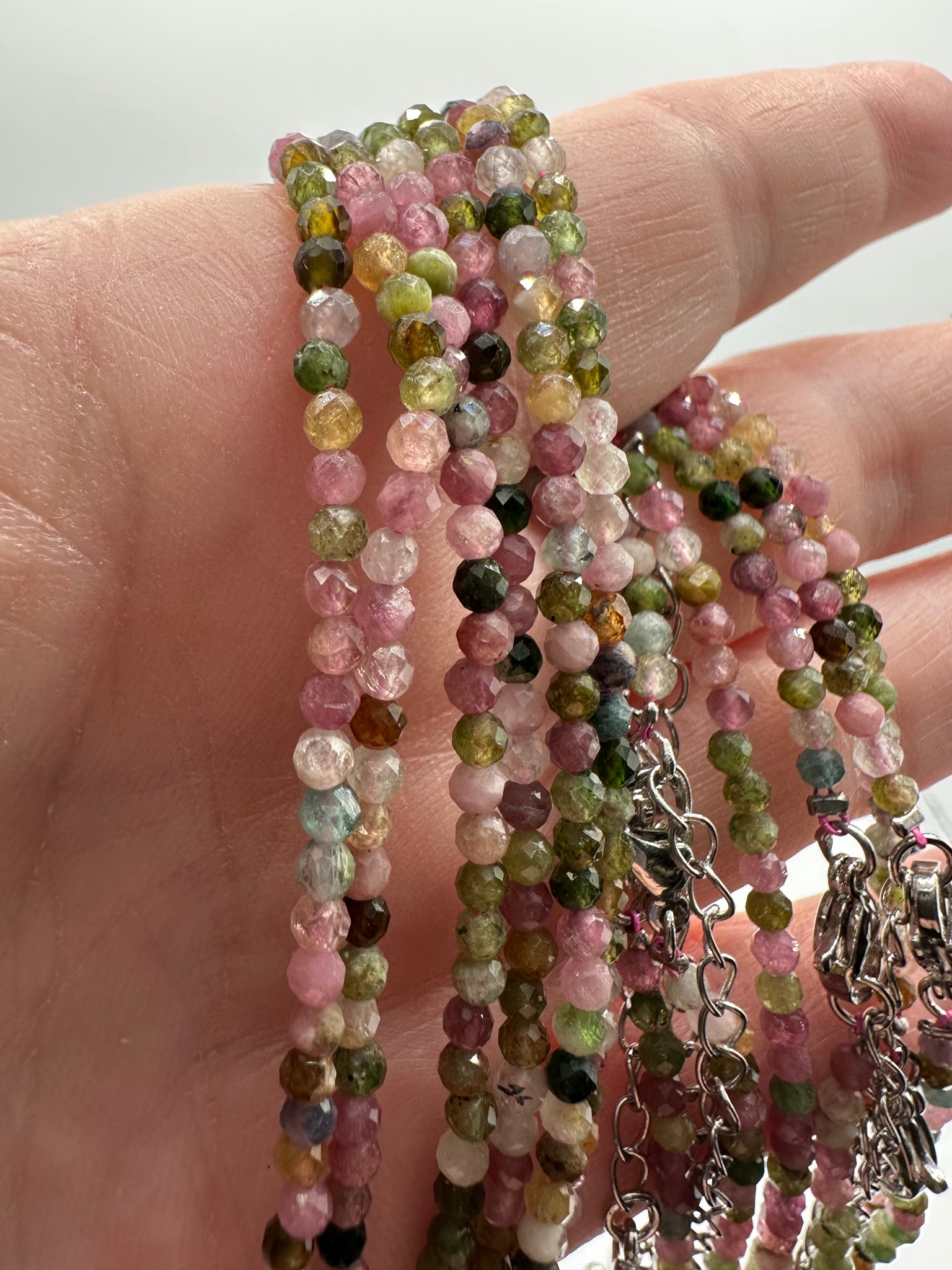 Expertly crafted with natural 3mm rainbow tourmaline, these necklaces are the perfect way to add a touch of color and elegance to any outfit. Each necklace is unique, showcasing the stunning variety of colors that tourmaline has to offer. Elevate your style with the natural beauty of rainbow tourmaline. . Necklace length 16” plus 2” extension. Clasp and extensions are made with Stainless Steel.