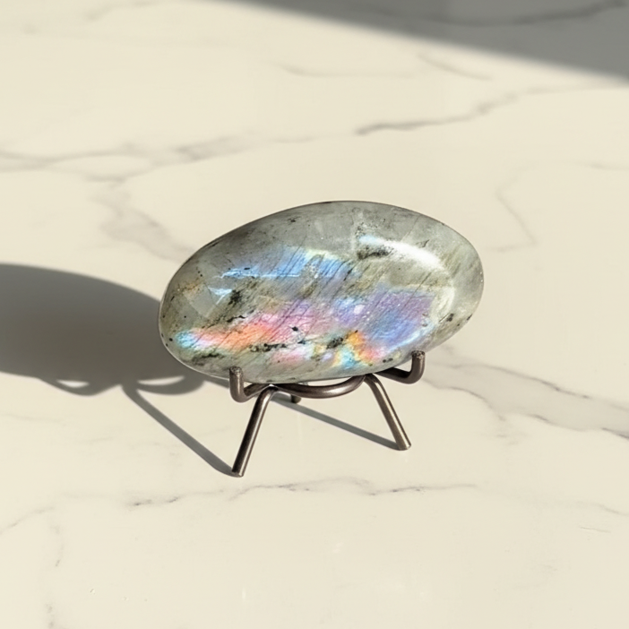Discover the mesmerizing beauty of this Labradorite Palmstone, a perfect companion for your collection or daily carry. Labradorite is renowned for its stunning labradorescence—a magical play of iridescent flashes that seem to dance across the stone's surface. Smooth and polished to perfection, this palm-sized piece fits naturally in your hand, making it ideal for meditation, energy work, or simply admiring its captivating optical effects. Labradorite is traditionally valued for promoting intuition and inner strength. Whether you're a seasoned collector or new to gemstones, this unique specimen offers both visual wonder and meaningful presence. Stand not included.