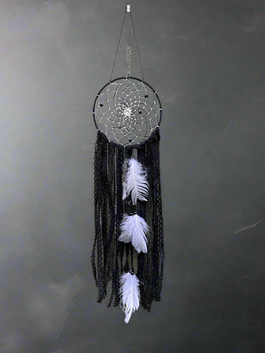 Protect your sweet dreams with our Black Dream Catcher! Featuring delicate feathers and intricate web design, our dream catcher is not only a beautiful addition to your bedroom decor but also filters out bad energy. Catch peaceful nights and good vibes with our Dream Catcher #4.