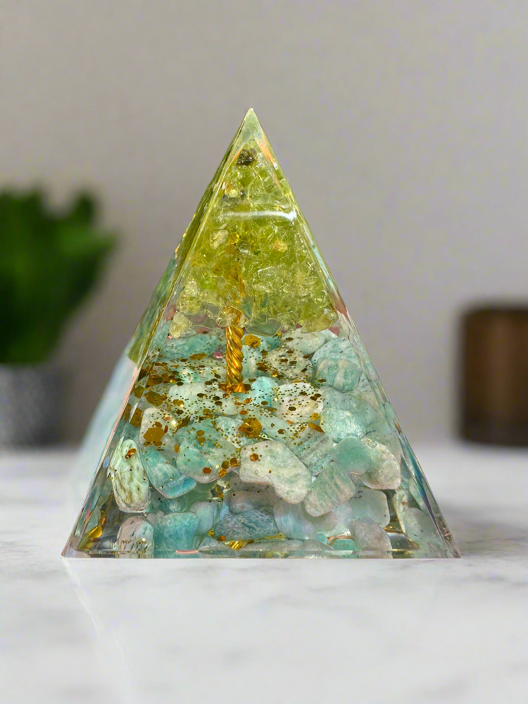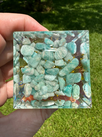 Discover the powerful healing properties of Amazonite with our Orgonite Pyramid #6. Made with love and intention, this pyramid can help to balance and protect your energy, while promoting relaxation and inner peace. Perfect for meditation, energy work, or as a beautiful addition to your home decor. Measures Approximately 2" x 2."