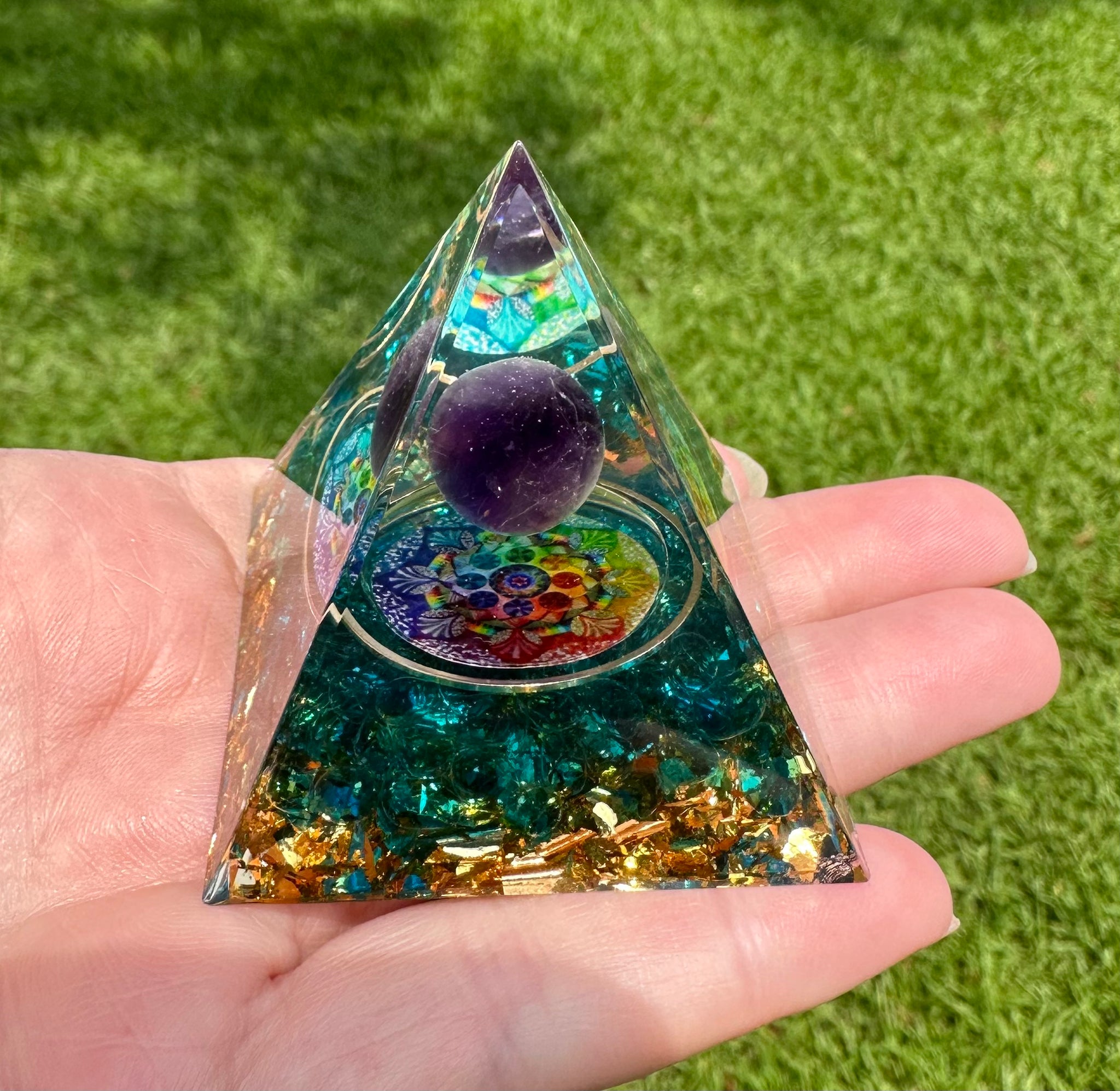 Elevate your energy with our Amethyst Orgonite Pyramid #8. This beautiful pyramid combines the powerful properties of amethyst and orgonite to promote overall well-being and balance. Enhance your meditation practice, purify your space, and protect against negative energy with this unique piece. Empower yourself today! Measures Approximately 2" x 2."