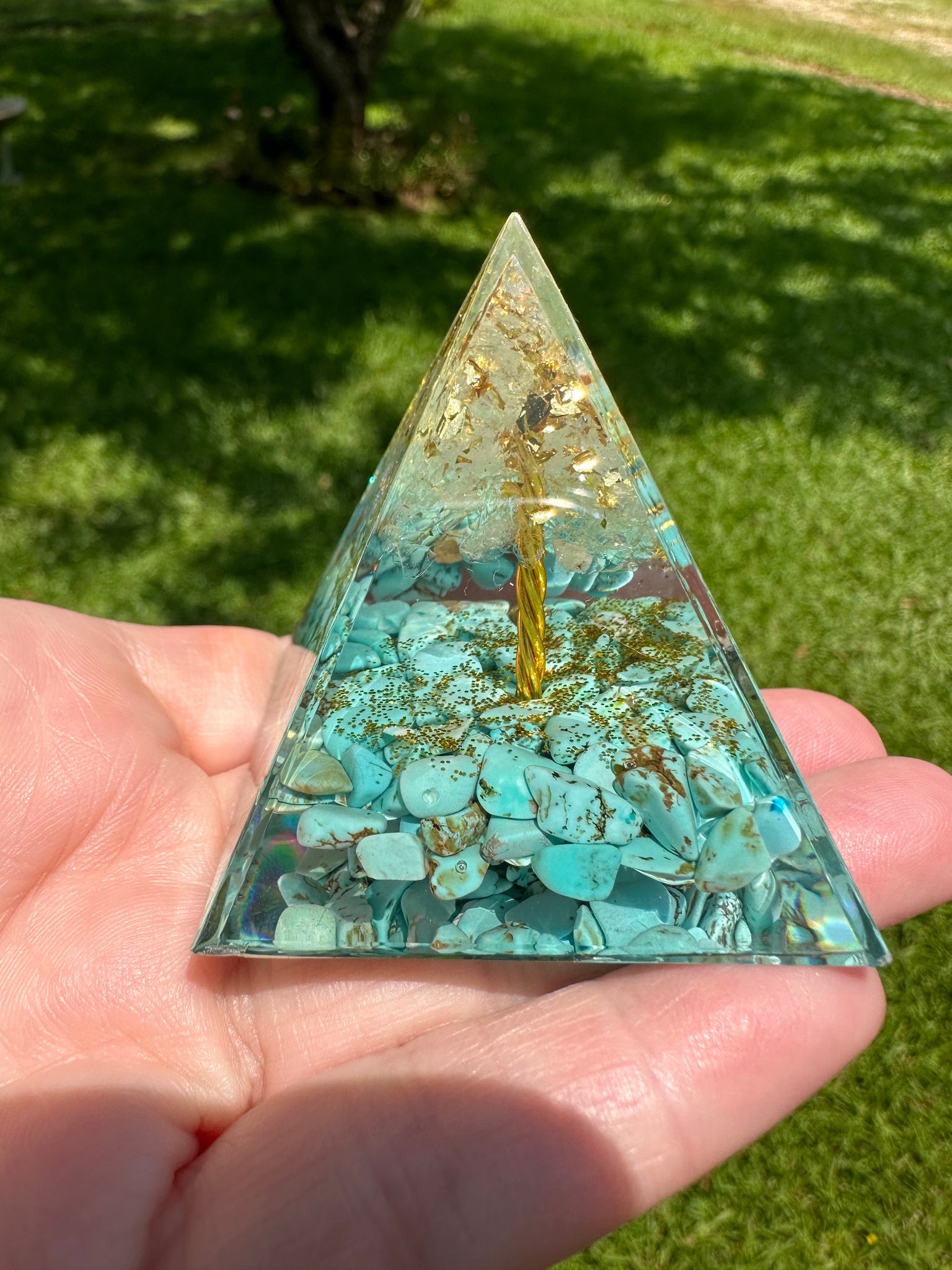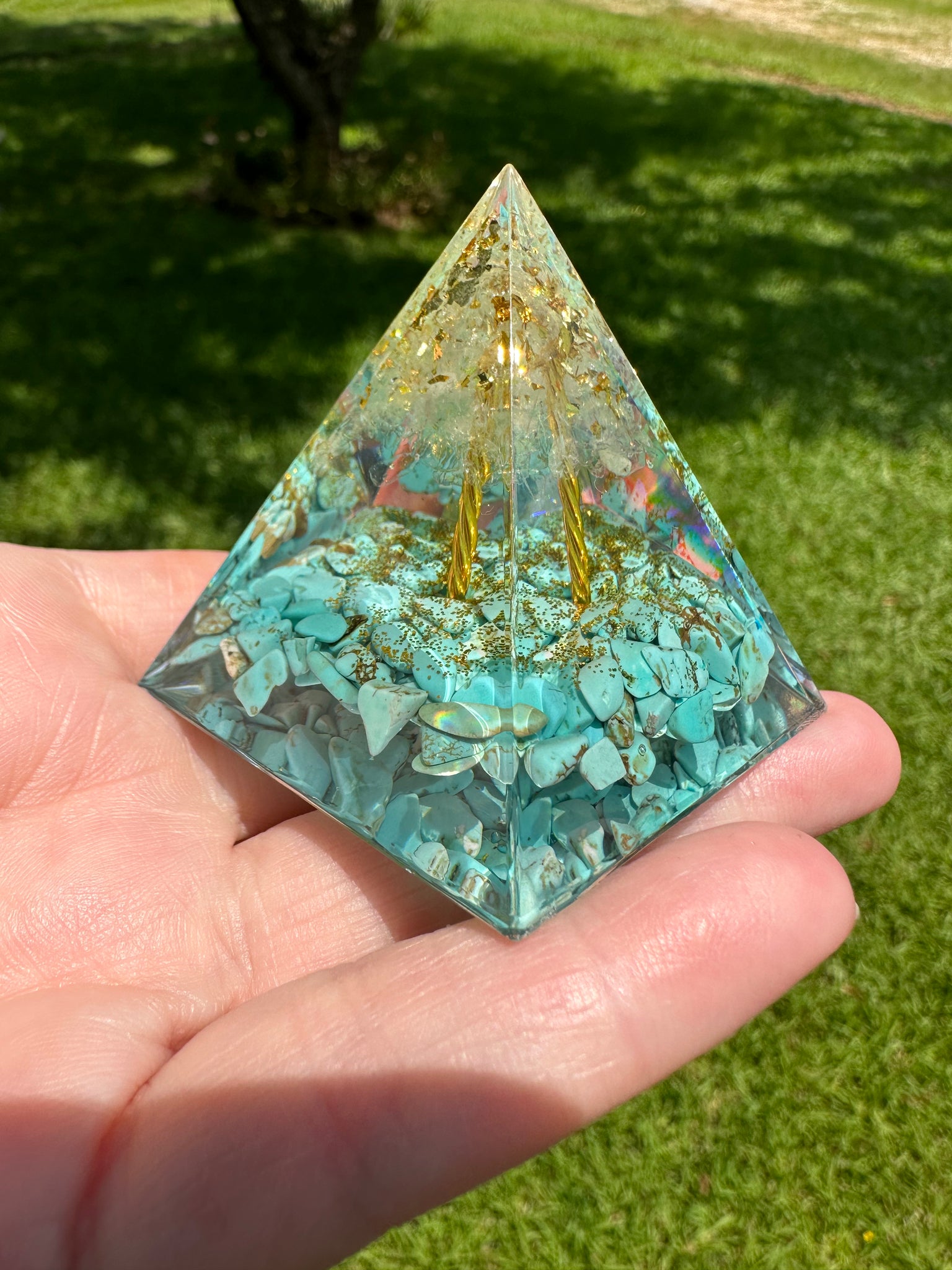 This beautiful Turquoise Orgonite Pyramid #3 is a powerful energy generator, combining the healing properties of turquoise with the positive effects of orgonite. Perfect for those seeking balance, protection, and connection to higher energies. Empower your space with this unique pyramid and experience its potential benefits. Measures Approximately 2" x 2."