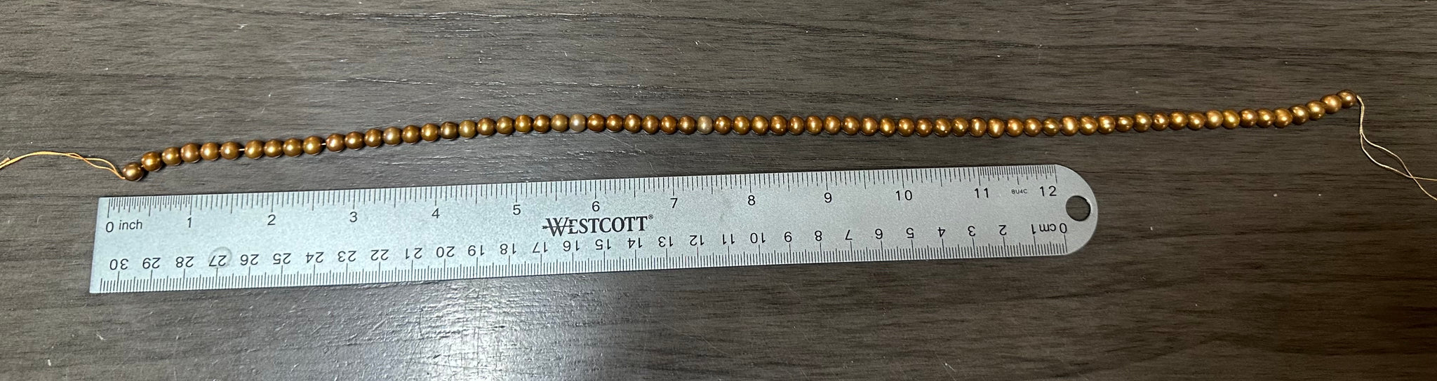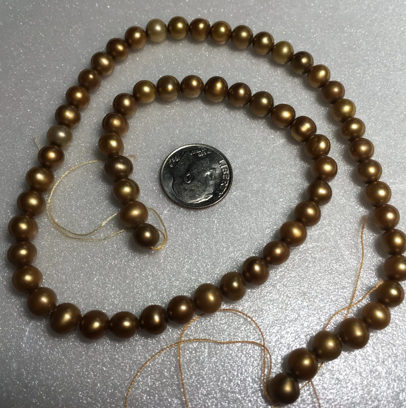 Elevate your style with our Bronze Freshwater Pearl Strand #14. Each pearl boasts a unique bronze hue, adding a touch of elegance to any outfit. Perfect for everyday wear or a special occasion, this strand is sure to make a statement. A must-have for any jewelry collection. These are for making jewelry and dyed.