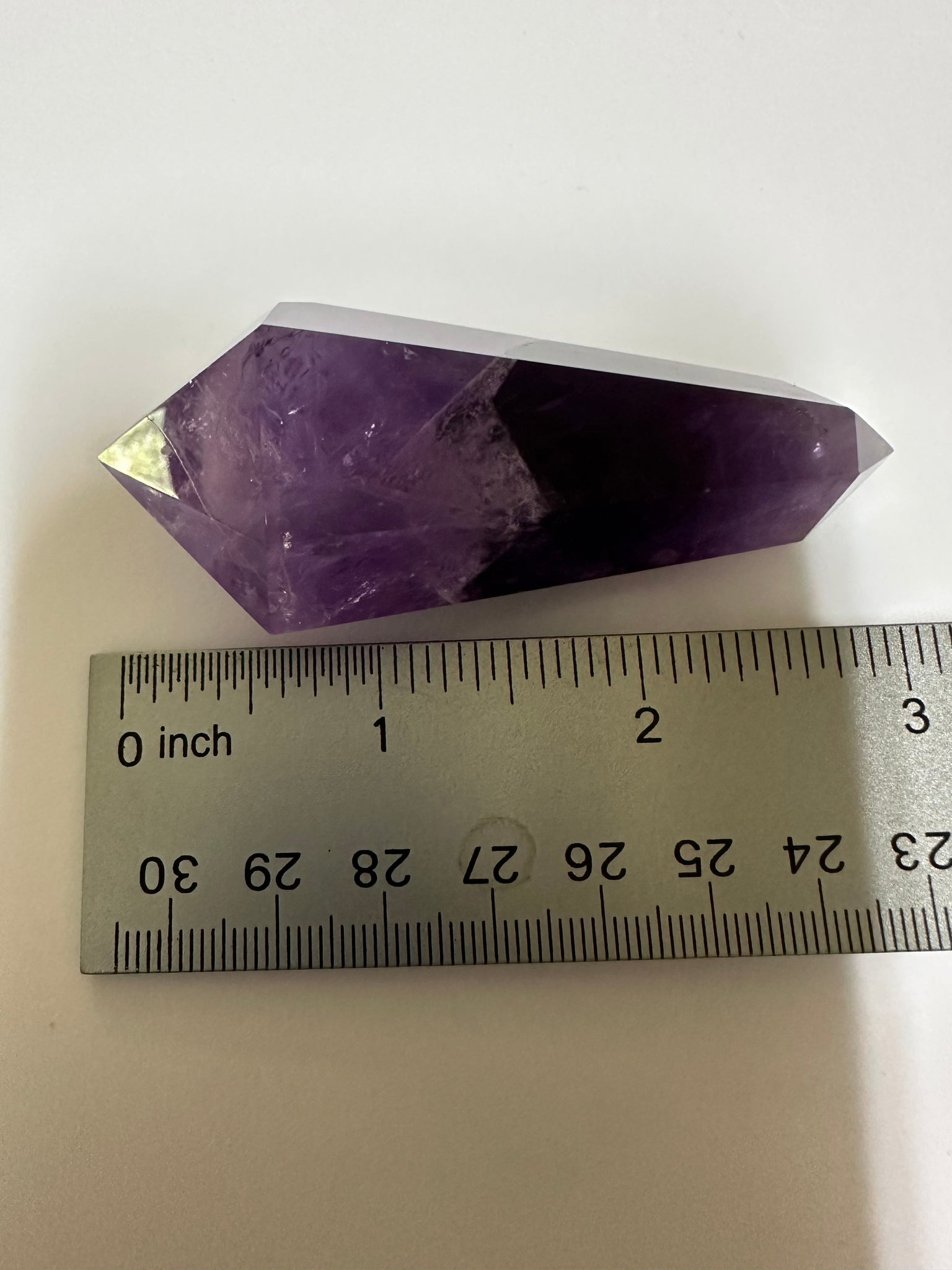 Elevate your crystal collection with this Double Terminated Phantom Amethyst Scepter Wand #2. Featuring natural phantom formations within vibrant amethyst, this wand is designed for enhanced energy flow and spiritual clarity. Its double-terminated points allow energy to move freely in both directions, making it ideal for meditation, healing, or enhancing your space. Experience the unique beauty and powerful properties of this rare amethyst scepter wand.
