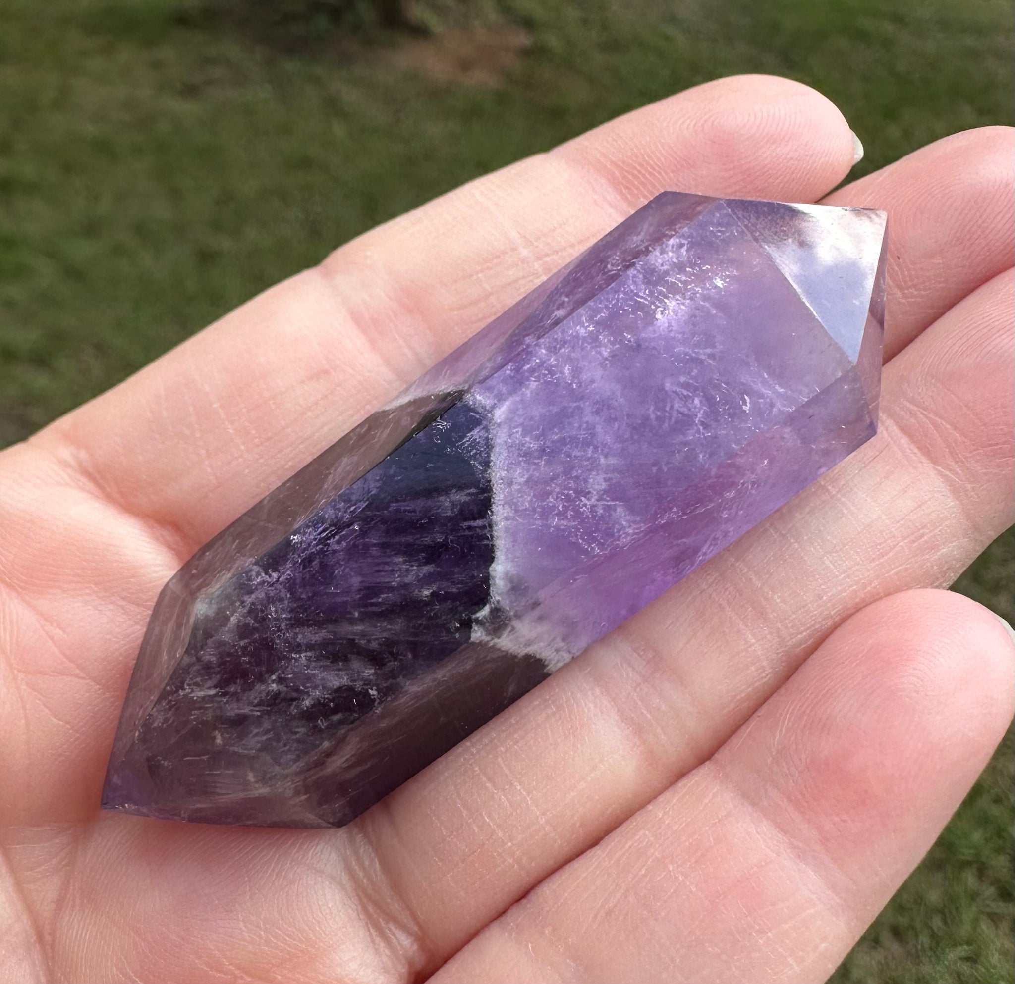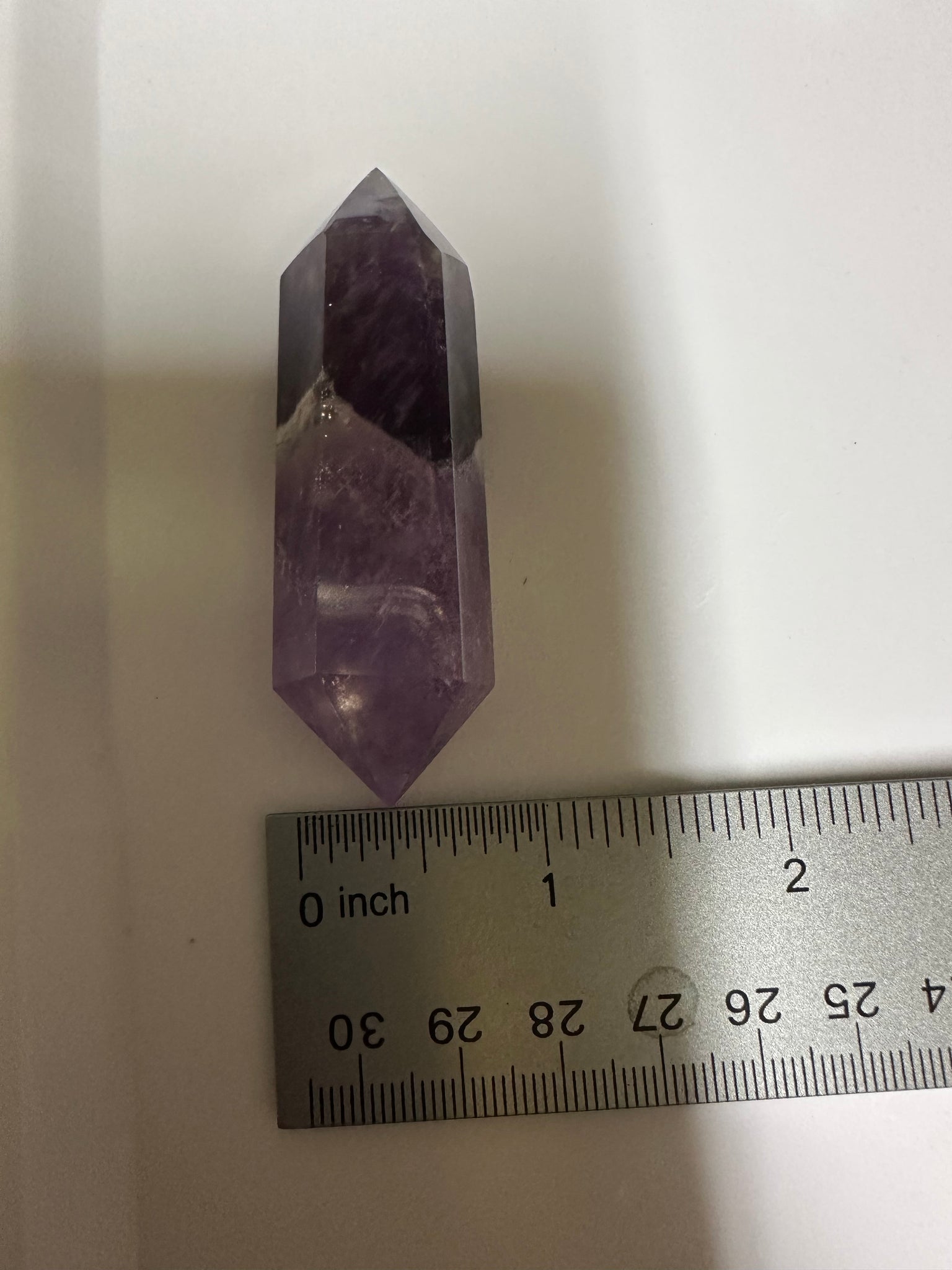 The Double Terminated Phantom Amethyst Scepter Wand #11 is a finely crafted crystal featuring distinct phantom formations within rich amethyst. Its double-terminated points facilitate balanced energy flow, making it an exceptional tool for advanced healing practices and spiritual work. The scepter design enhances energy amplification and focus, supporting deep meditation and transformation. Ideal for experienced practitioners seeking to harness the unique vibrational qualities of phantom amethyst in their energy routines.