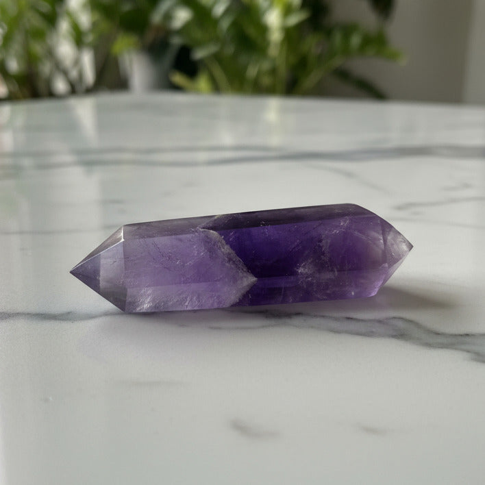 This Double Terminated Phantom Amethyst Scepter Wand #24 features natural phantom formations within vibrant amethyst, symbolizing growth and transformation. Its double-terminated points allow energy to flow freely in both directions, making it ideal for meditation, healing, and spiritual work. This wand supports clarity and calm, helping you connect deeply with your inner self and enhance your energy balance. Perfect for those seeking gentle guidance and emotional support on their journey.