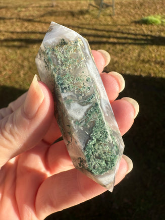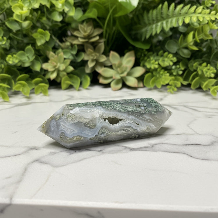 Experience the healing and grounding powers of our Moss Agate Double Terminated Point #6. This unique crystal features a double termination, harnessing energy from both ends for balance and connection. With the calming properties of moss agate, this point brings clarity, harmony, and stability into your life.