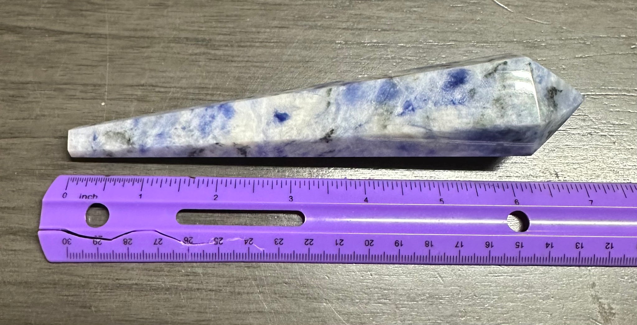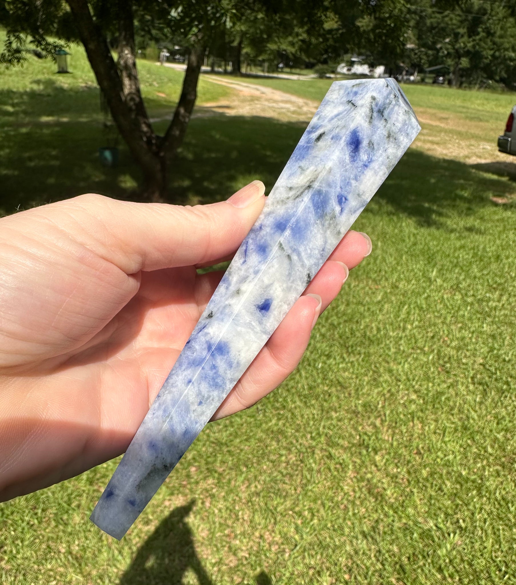 This stunning Large Sodalite Scepter #6 showcases the beauty and energy of sodalite crystal. Its large size makes it a powerful tool for crystal healing and meditation, promoting inner peace, clarity, and harmony. Elevate your spiritual practice with this unique and beautiful crystal.