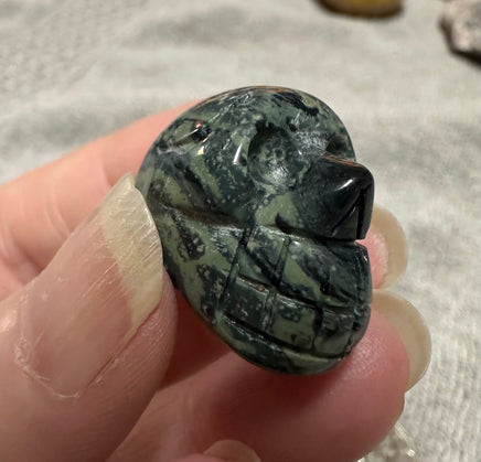 This Kambaba Jasper Skull is a unique and eye-catching addition to any crystal collection. Its bold green and black patterns are believed to promote balance and tranquility, making it a perfect meditation tool. Hand-carved by skilled artisans, each skull is one-of-a-kind.