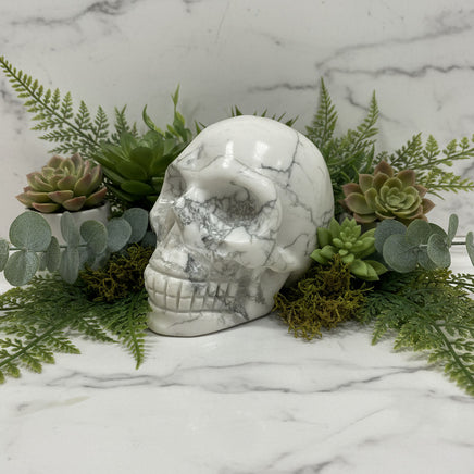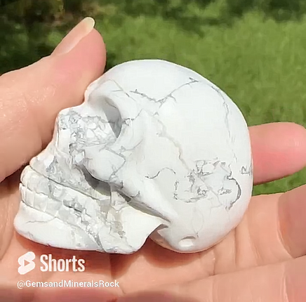 Discover the calming energy of this Natural Howlite Skull, expertly carved to highlight the stone's unique white and gray veining. Known for its soothing properties, howlite can help reduce stress and promote peacefulness. This skull makes a meaningful addition to your collection or a thoughtful gift for someone seeking balance and tranquility in their space. Natural Gemstone 2"
