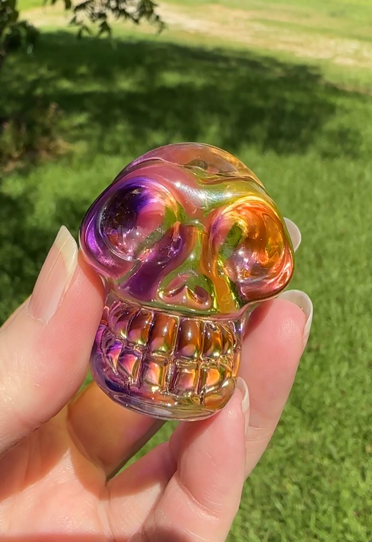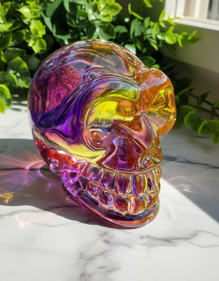 This Purple & Yellow Glass Skull is a striking decorative piece that adds a unique touch to any space. Crafted with vibrant purple and yellow glass, it captures light beautifully, creating an eye-catching display. Perfect for collectors or as a bold accent in your home, this skull combines artistic design with vivid colors to inspire curiosity and conversation.