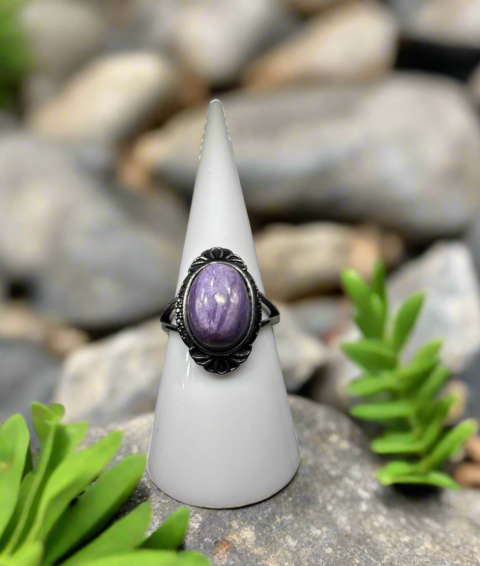 Elevate your style with the Natural Charoite Ring #1, featuring a stunning, rare purple charoite stone known for its unique swirling patterns. This ring not only adds a touch of elegance but also makes a distinctive statement with its vibrant colors. Perfect for those who appreciate natural beauty and handcrafted quality, it enhances any outfit while offering a meaningful accessory you’ll cherish.