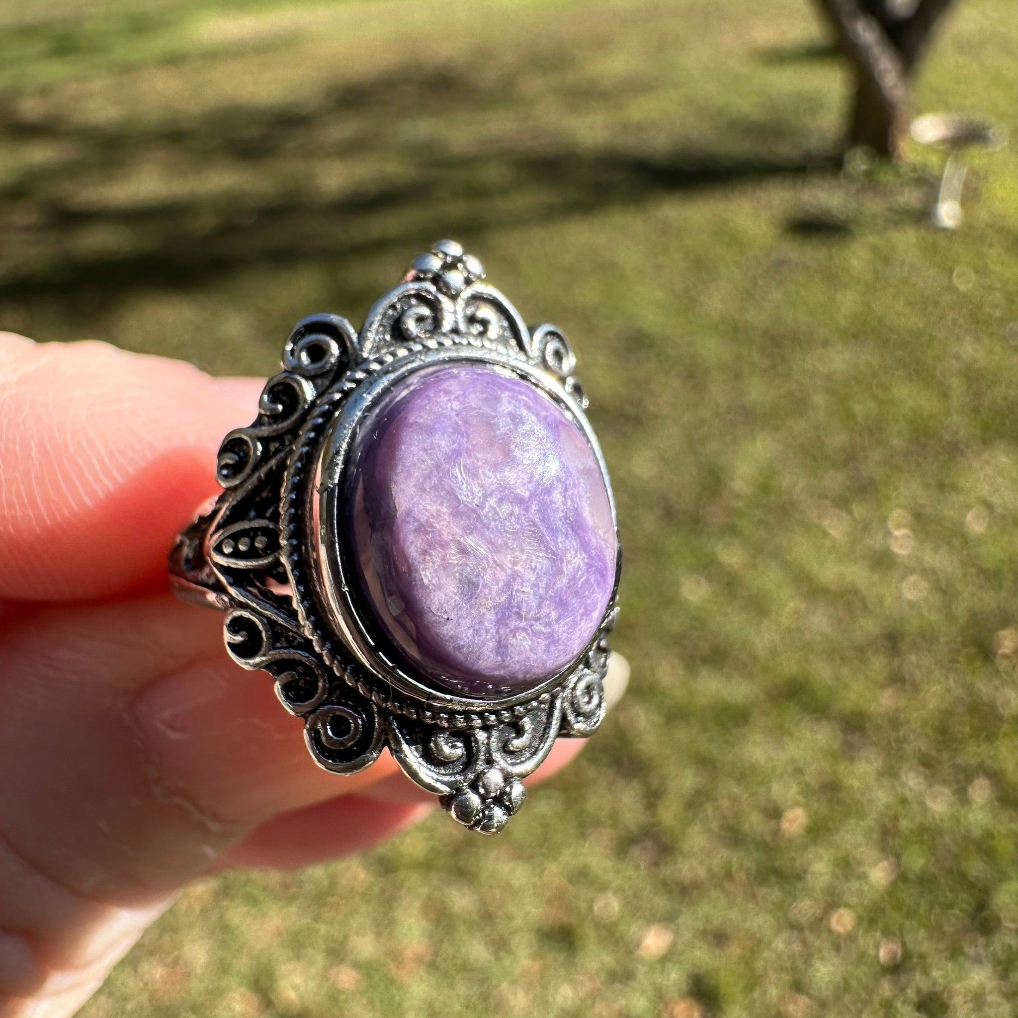 Discover the unique beauty of the Natural Charoite Ring, featuring a striking purple stone renowned for its swirling patterns and captivating hues. This ring adds an elegant, one-of-a-kind touch to any outfit, perfect for those who appreciate natural gemstones and handcrafted jewelry. Its comfortable fit and durable design ensure you can wear it daily, making it a meaningful accessory that highlights your personal style. Elevate your collection with this rare and mesmerizing piece.