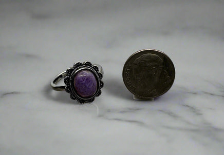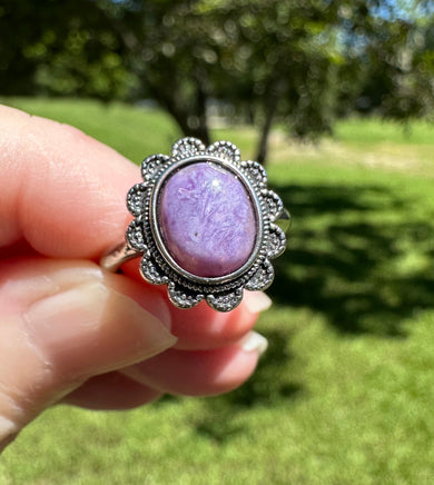 Discover the unique beauty of the Natural Charoite Ring #4, featuring a striking purple stone renowned for its swirling patterns and captivating hues. This ring adds an elegant, one-of-a-kind touch to any outfit, perfect for those who appreciate natural gemstones and handcrafted jewelry. Its comfortable fit and durable design ensure you can wear it daily, making it a meaningful accessory that highlights your personal style. Elevate your collection with this rare and mesmerizing piece.