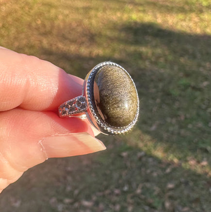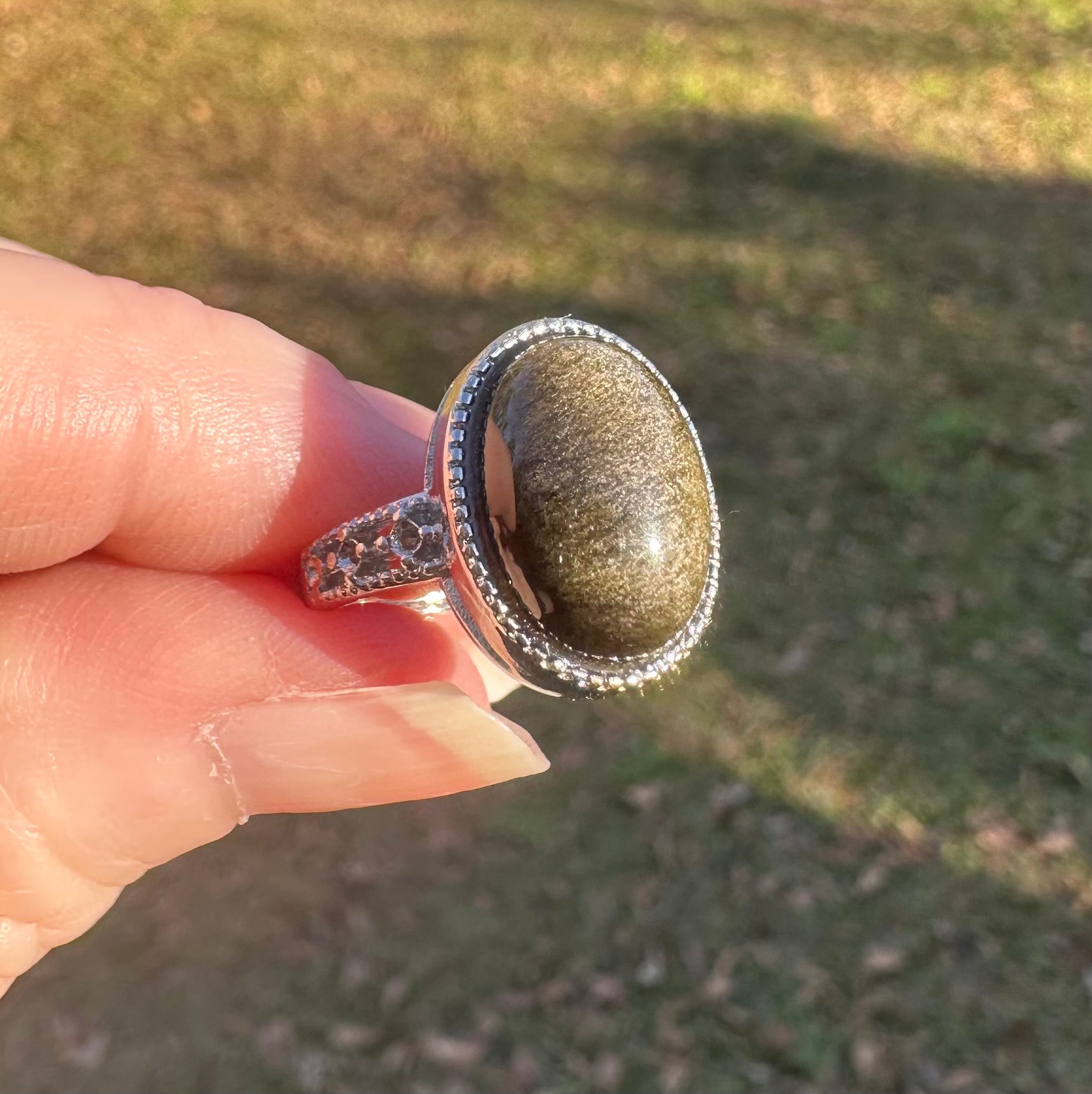 Add a touch of elegance to your style with our Natural Gold Sheen Obsidian Rings. Crafted with high-quality natural gold sheen obsidian, these rings not only offer a sophisticated look but also possess healing properties that can reduce stress and increase self-confidence. Elevate your fashion and well-being with these stunning rings.