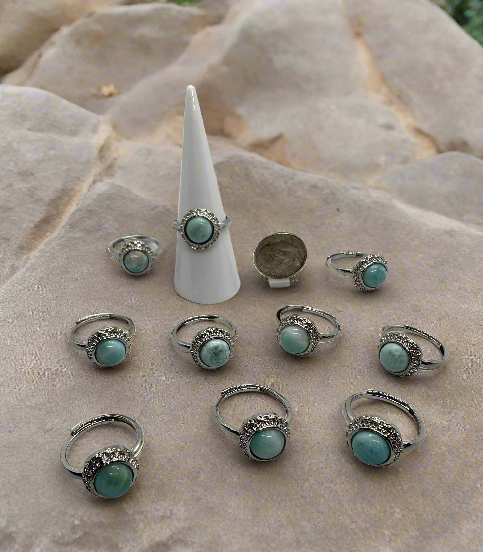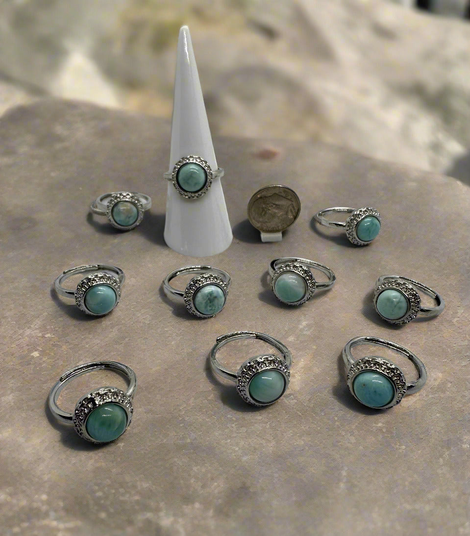 Elevate your style with our Natural Larimar Rings. Made from genuine Larimar stone, these rings are a unique and beautiful addition to any jewelry collection. The soft blue hues of the Larimar stone will add a touch of tranquility and elegance to any outfit.