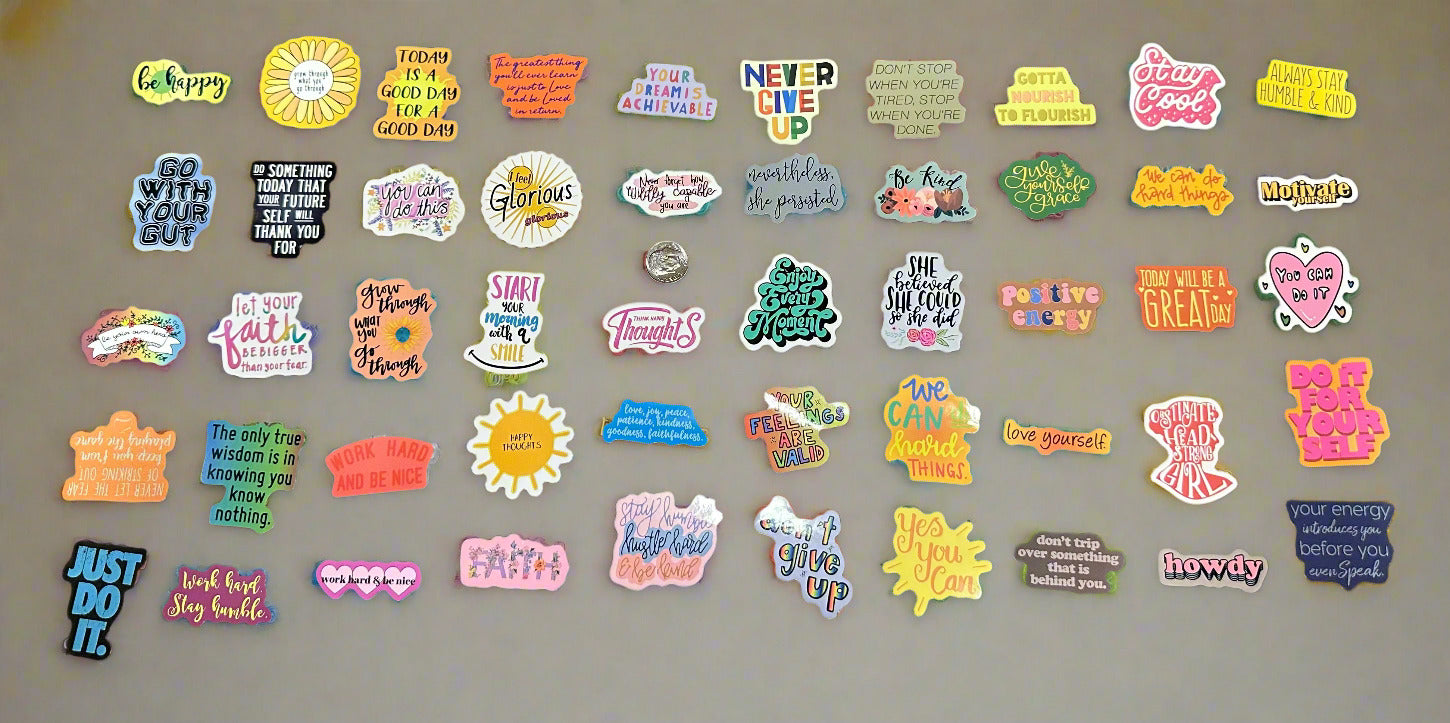 Get inspired and motivated with our set of 50 Inspirational Stickers! Each sticker features a unique design and uplifting message to keep you going throughout the day. Perfect for notebooks, water bottles, laptops, and more. Spread positivity and good vibes wherever you go!
