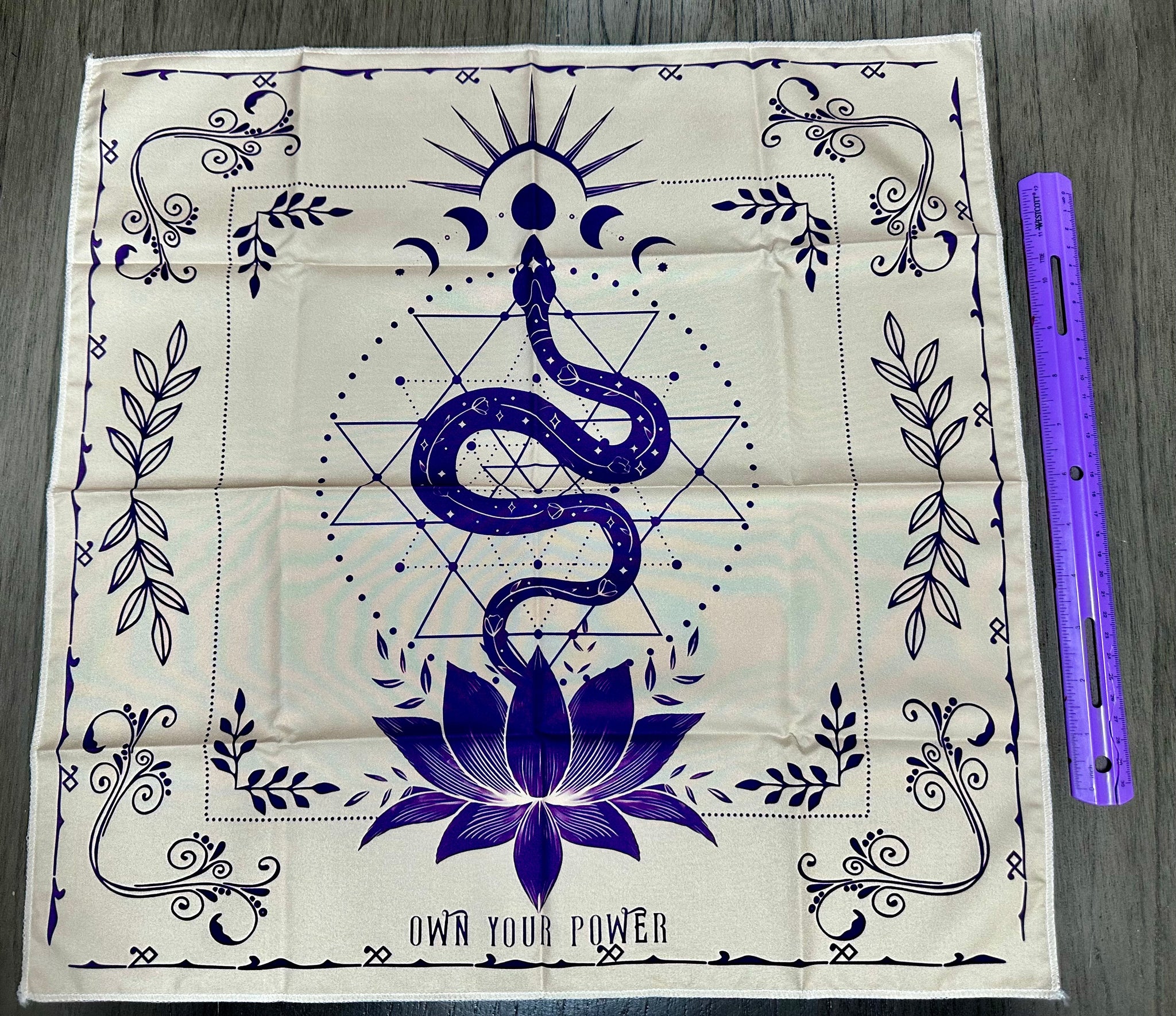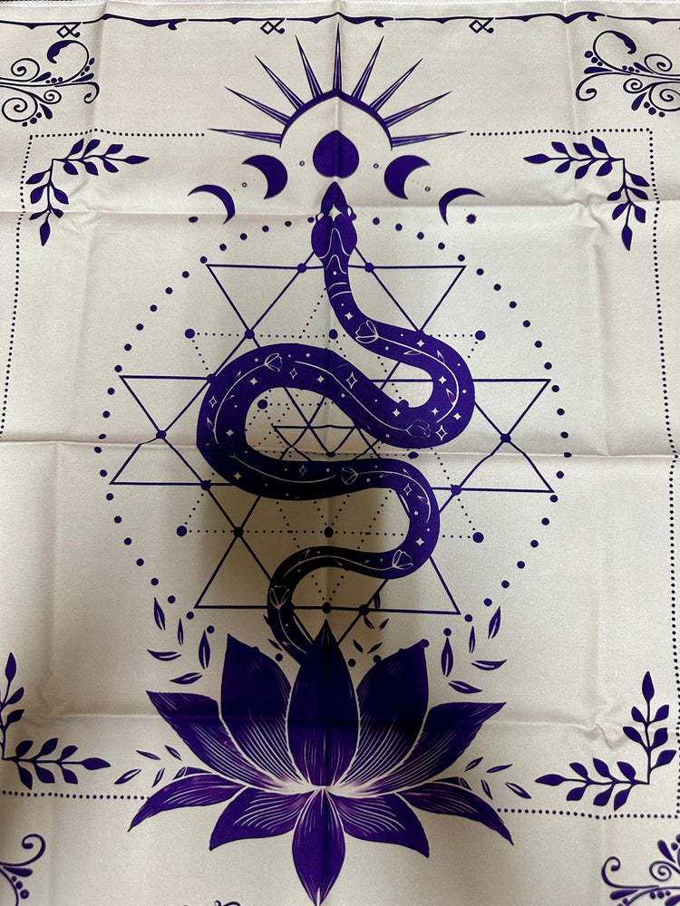 Enhance your tarot or altar setup with our Moon Phase & Snake Tarot/Altar Cloth Tapestry. Featuring beautifully detailed moon phases and serpent designs, this cloth not only adds a decorative touch but also aids in connecting with lunar energies and divine wisdom.