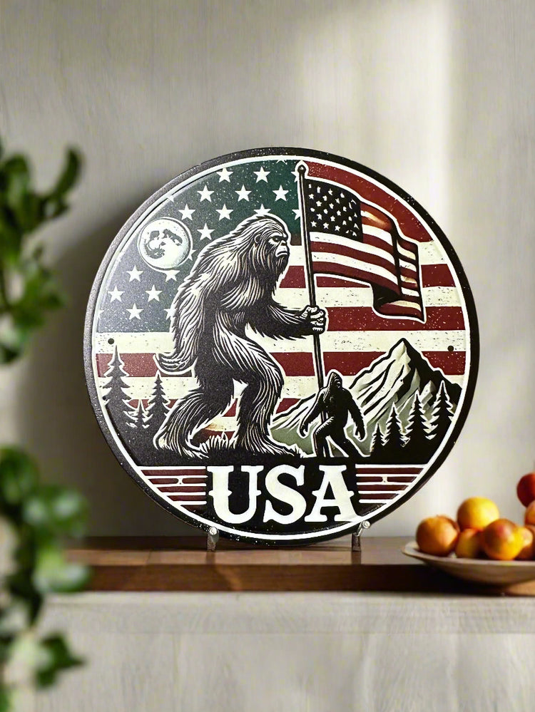 Celebrate your love for quirky Americana with the Sasquatch With American Flag Novelty Tin Sign. Perfect for adding a bold, playful touch to any space, this durable tin sign features a striking design of Sasquatch wrapped in the iconic stars and stripes. Its eye-catching visuals make it a great conversation starter for your home, office, or man cave, while the sturdy construction ensures lasting display. Embrace a fun and patriotic vibe effortlessly with this unique collectible piece.