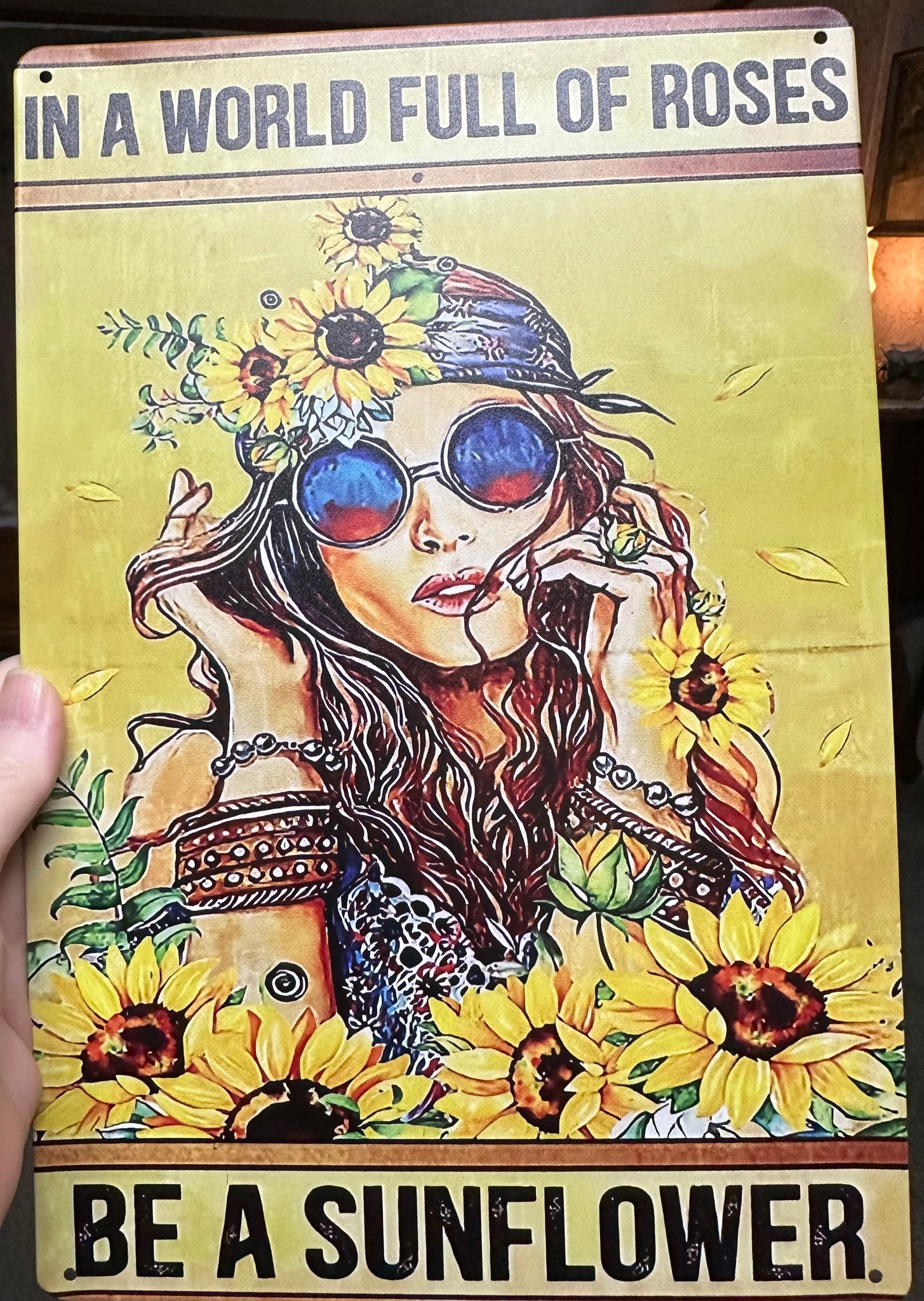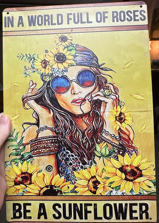 Embrace positivity with this charming tin sign that reads "In a World Full of Roses Be a Sunflower". Let the vibrant colors and uplifting message remind you to be resilient and find joy in the midst of life's challenges. Perfect for any room in your home or as a thoughtful gift for a loved one.