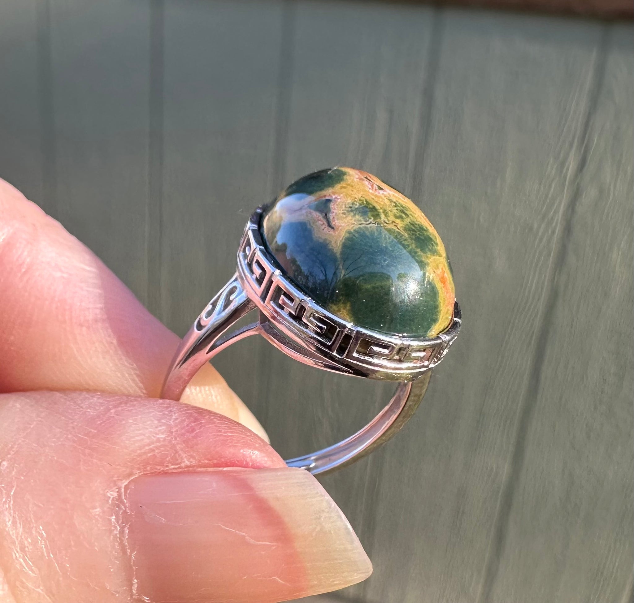 Unleash the beauty of nature with our 8th Vein Ocean Jasper S925 Sterling Silver Ring #5. Crafted with intricate details and quality materials, this ring boasts a one-of-a-kind ocean jasper stone that will add a touch of elegance to any outfit. Perfect for any occasion, this ring is a must-have for any jewelry collection.