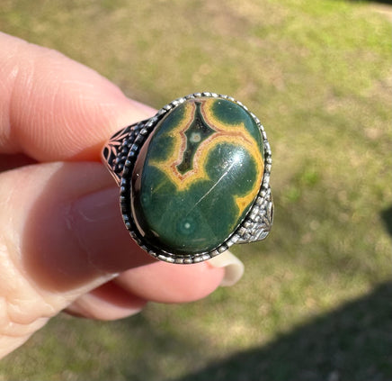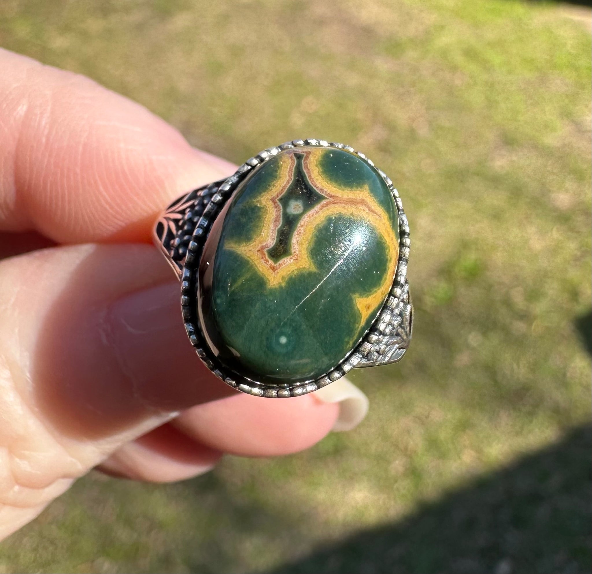 Elevate your style with our exquisite 8th Vein Ocean Jasper S925 Sterling Silver Ring #6. Crafted with stunning Ocean Jasper stones and quality S925 sterling silver, this ring is the perfect addition to any jewelry collection. Feel confident and stylish with this unique and eye-catching piece.