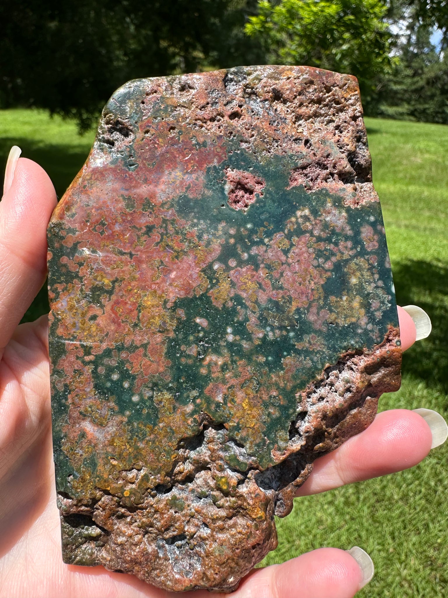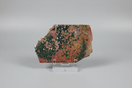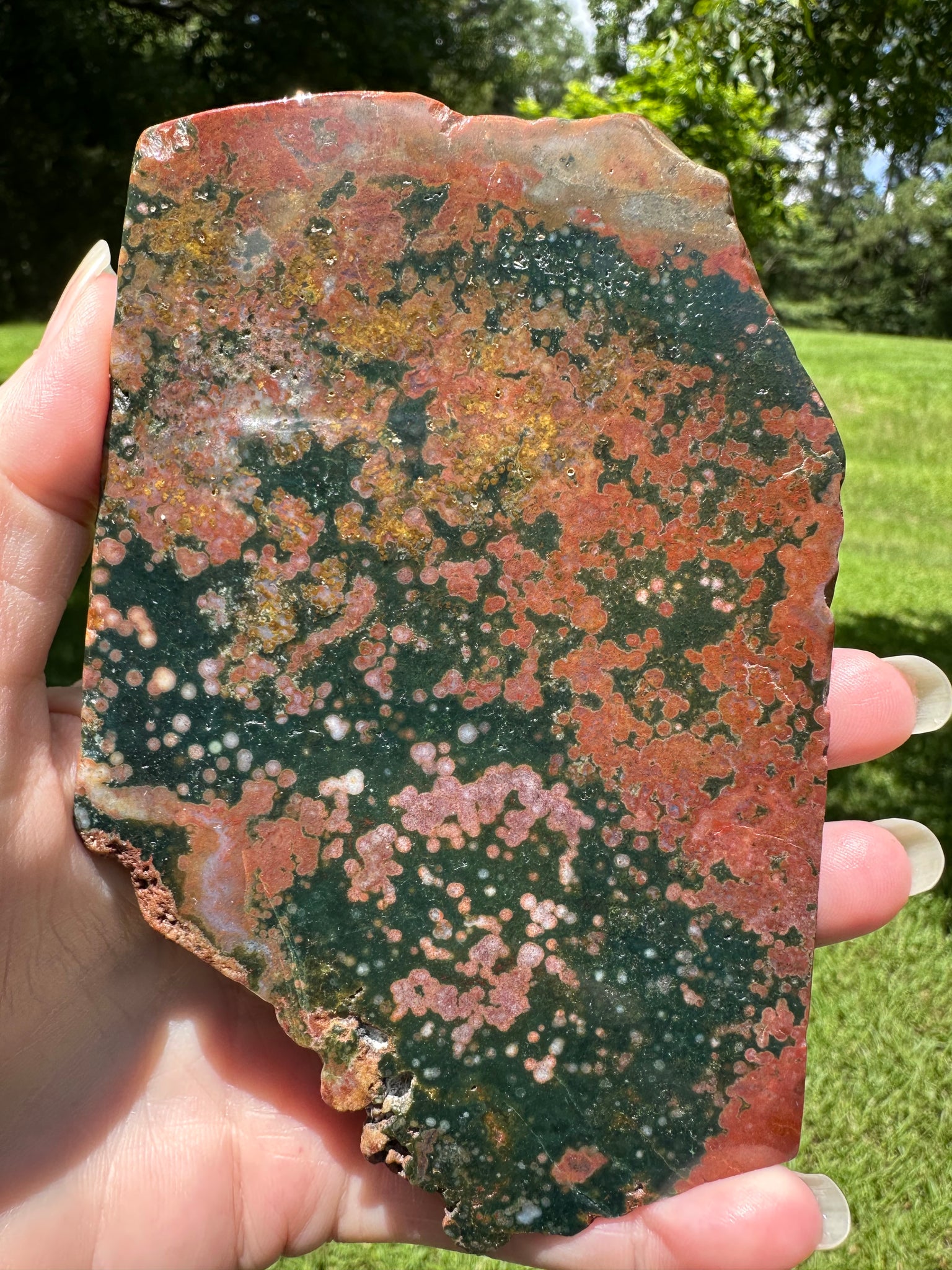 The 8th Vein Ocean Jasper Slab #104 is a premium specimen prized for its distinctive banding and rich color palette. This slab exhibits the characteristic orbicular patterns and multi-tonal layers that define high-quality ocean jasper. Ideal for collectors and lapidary experts, it offers both aesthetic appeal and geological interest, making it a valuable addition to any mineral collection or study.