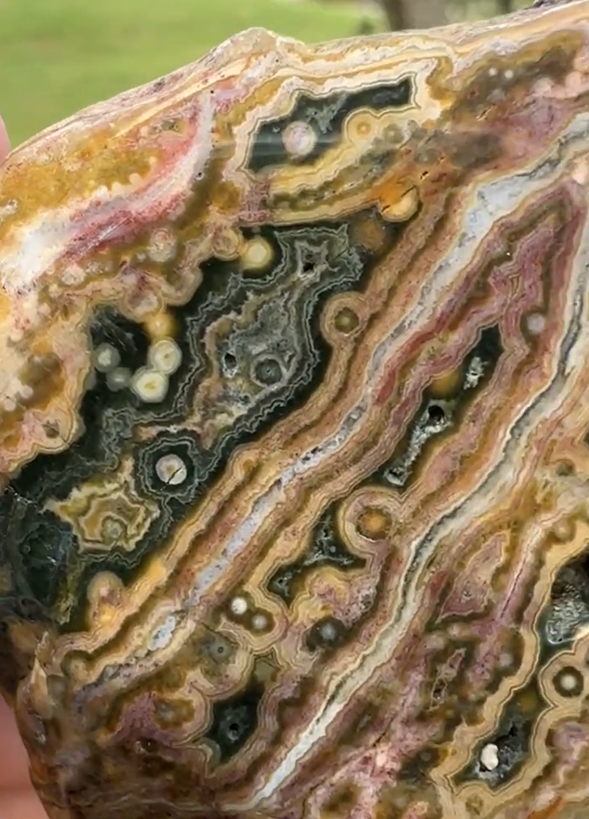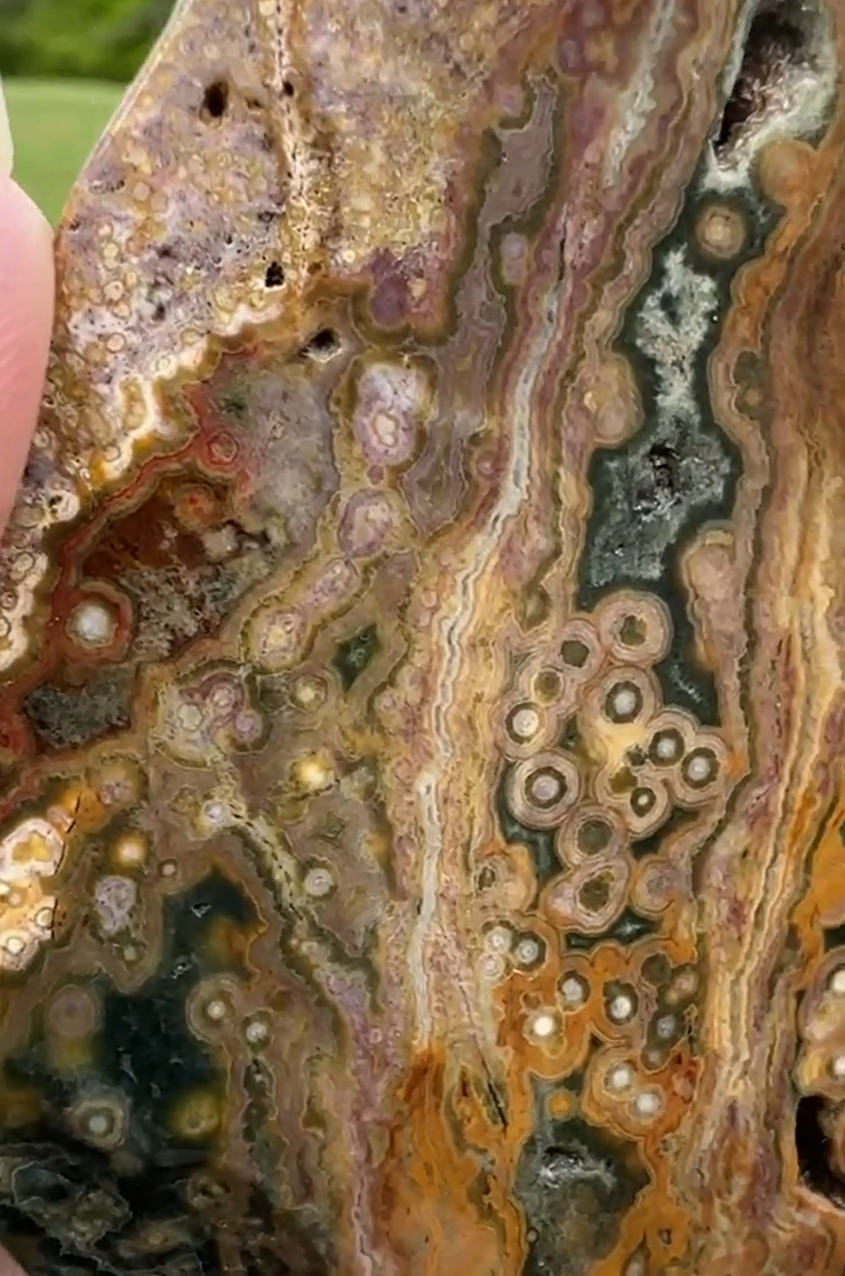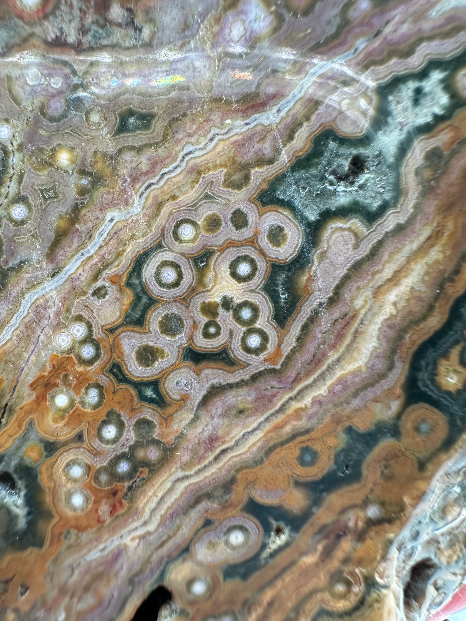 Discover the mesmerizing beauty of this 8th Vein Ocean Jasper Slab, a stunning natural specimen showcasing swirling patterns of soft greens, creams, and earth tones. Each piece is uniquely formed by nature, displaying the characteristic orbicular formations that make Ocean Jasper so prized by collectors and crystal enthusiasts. Perfect for display, jewelry making, or adding to your mineral collection. A truly one-of-a-kind treasure that brings natural elegance and grounding energy to any space.