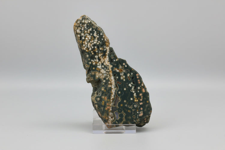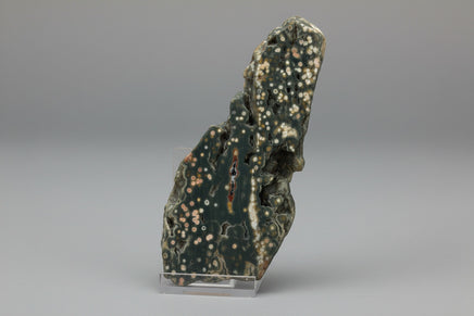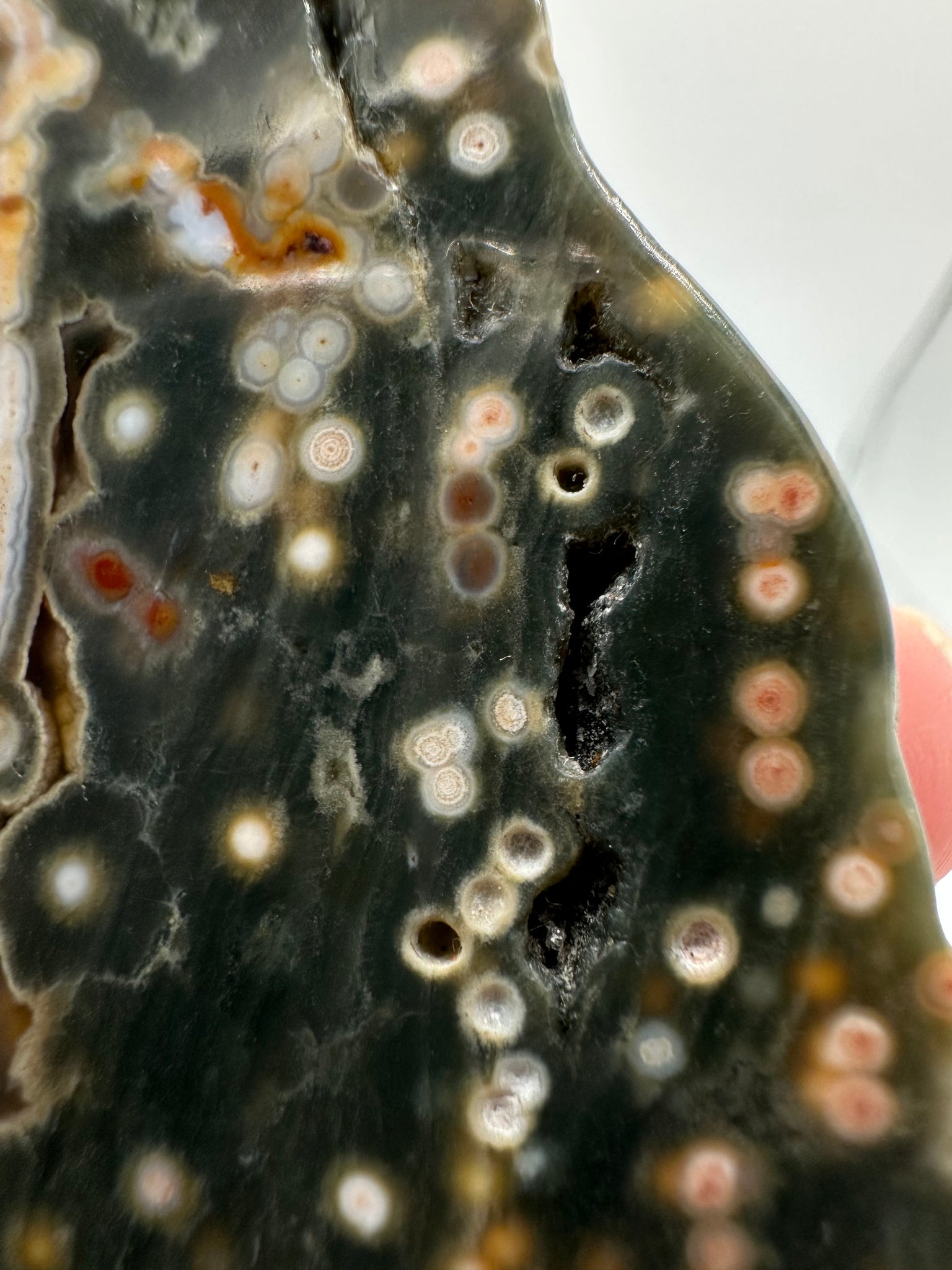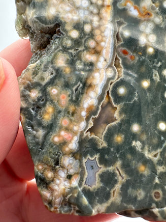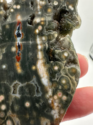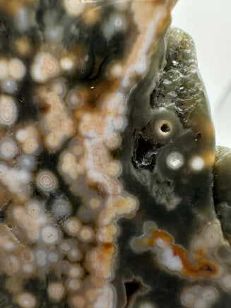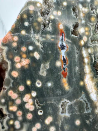 Discover the mesmerizing beauty of this 8th Vein Ocean Jasper Slab, a stunning natural specimen showcasing swirling patterns of soft greens, creams, and earth tones. Each piece is uniquely formed by nature, making this slab a one-of-a-kind addition to any collection. Ocean Jasper is prized for its calming energy and grounding properties, believed to promote tranquility and emotional balance. Perfect for collectors, decorators, or those seeking a meaningful natural treasure, this slab brings the serene essence of the ocean into your space. Display it proudly as a conversation starter or use it in your crystal practice.
