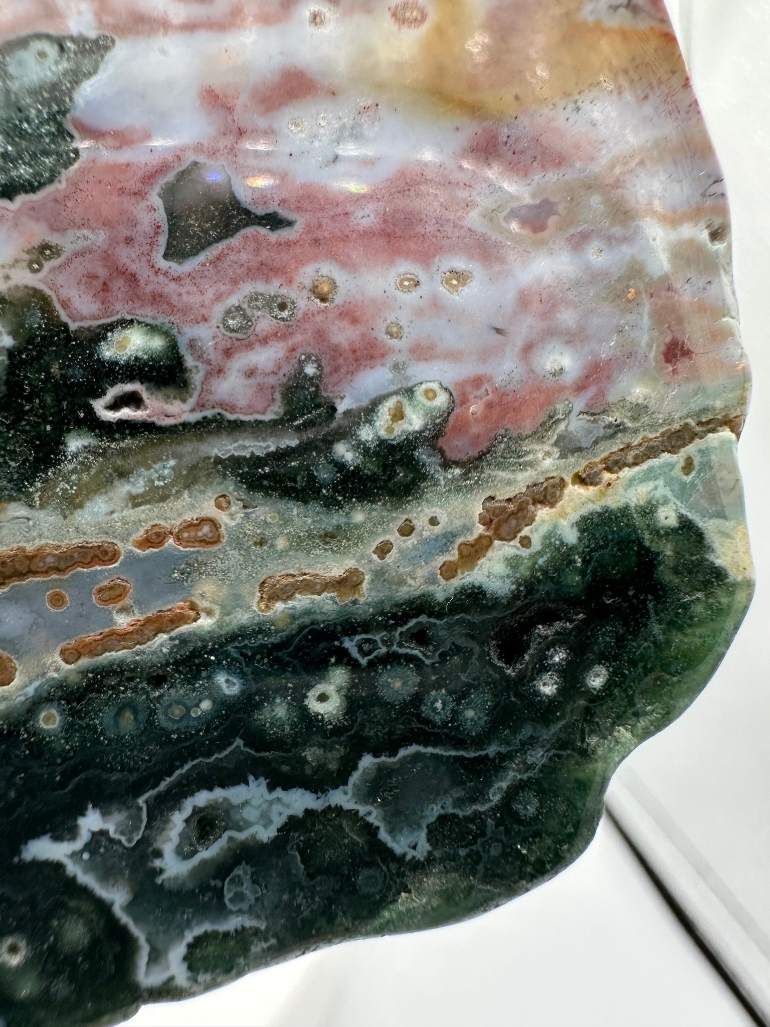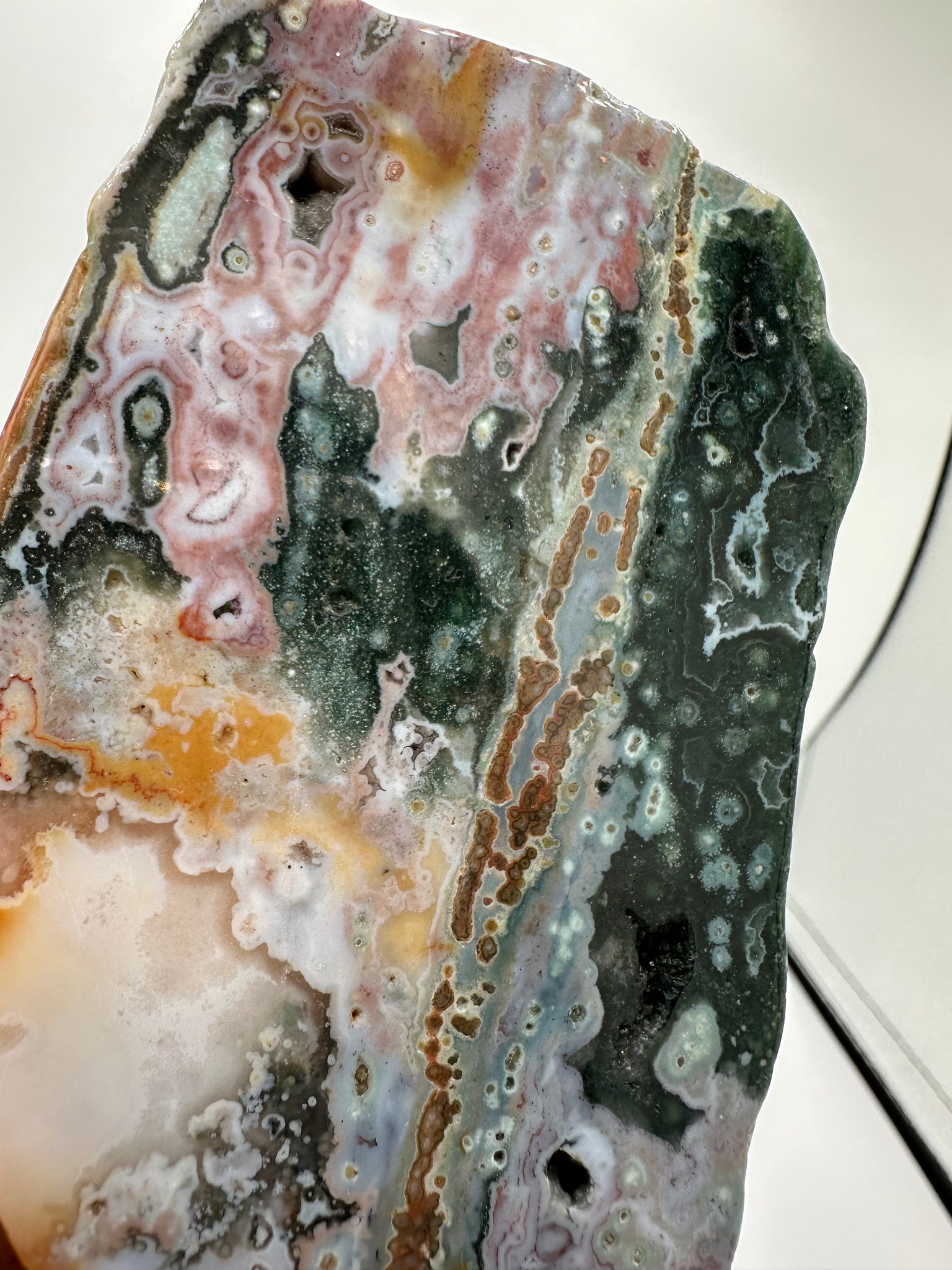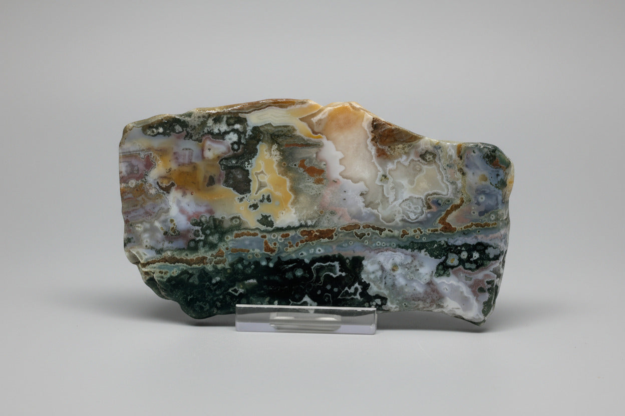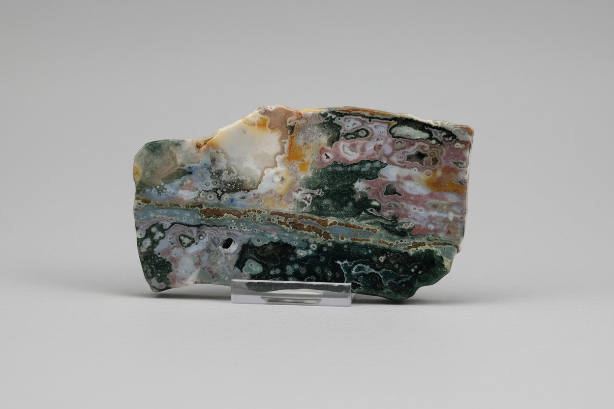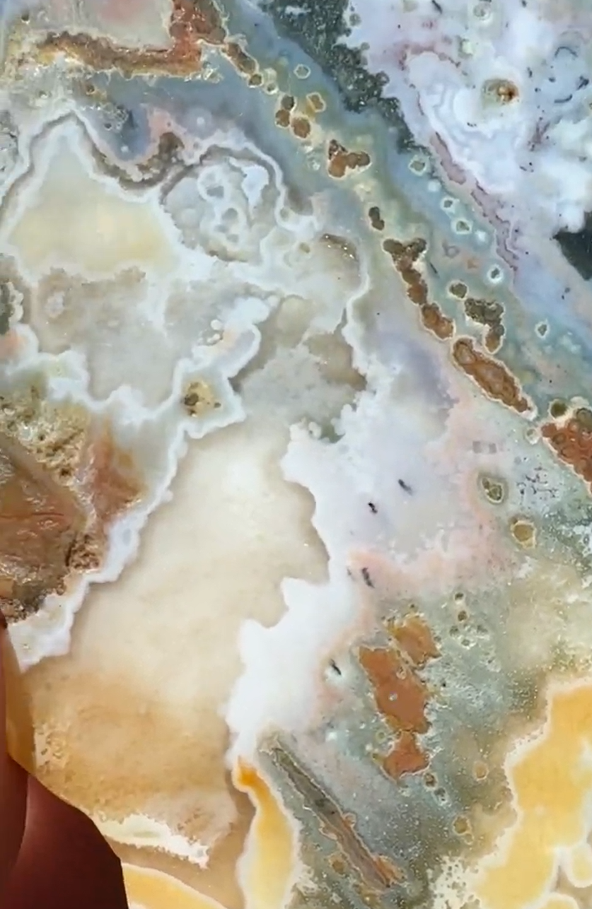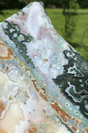 The 8th Vein Ocean Jasper Slab #42 showcases stunning natural patterns and soothing colors that bring a sense of calm and balance to any space. This unique slab is perfect for those who appreciate the beauty of nature and want to add a supportive, grounding element to their collection or décor. Its intricate design and vibrant hues make it a meaningful addition that encourages relaxation and positive energy.