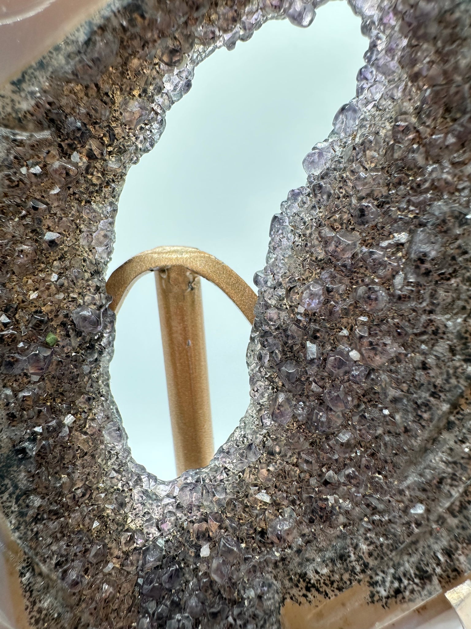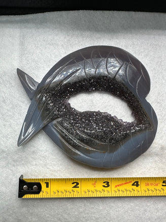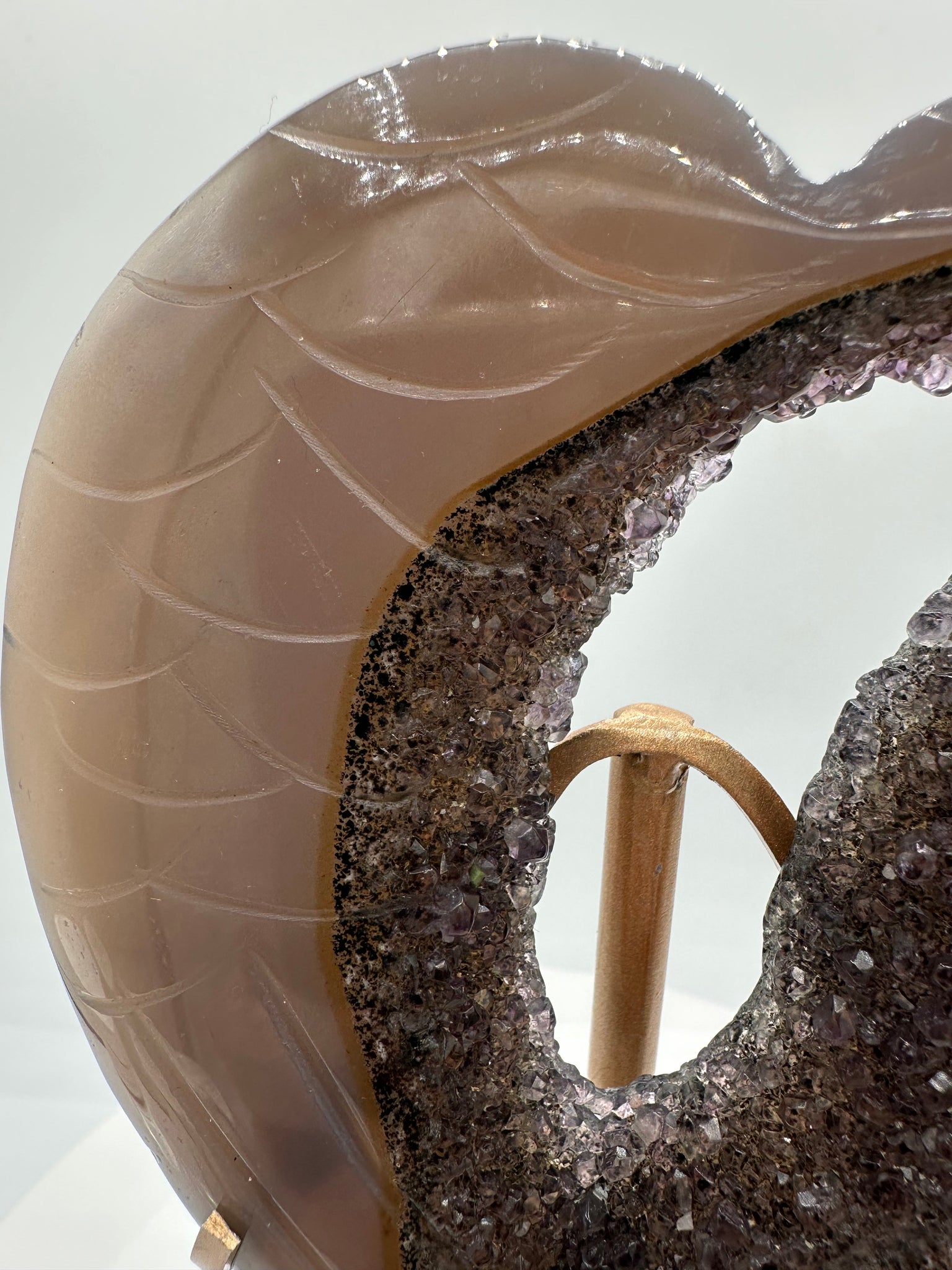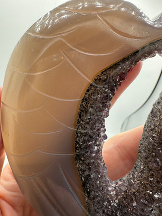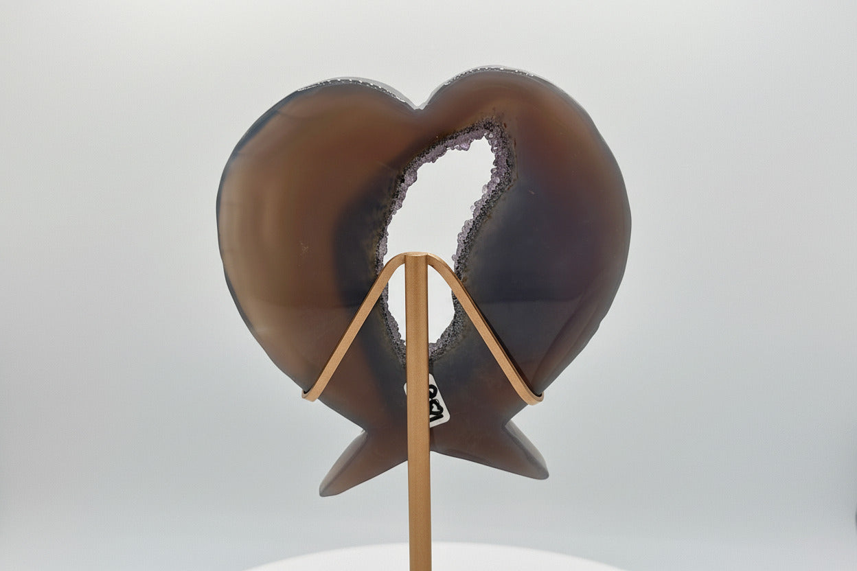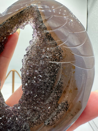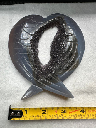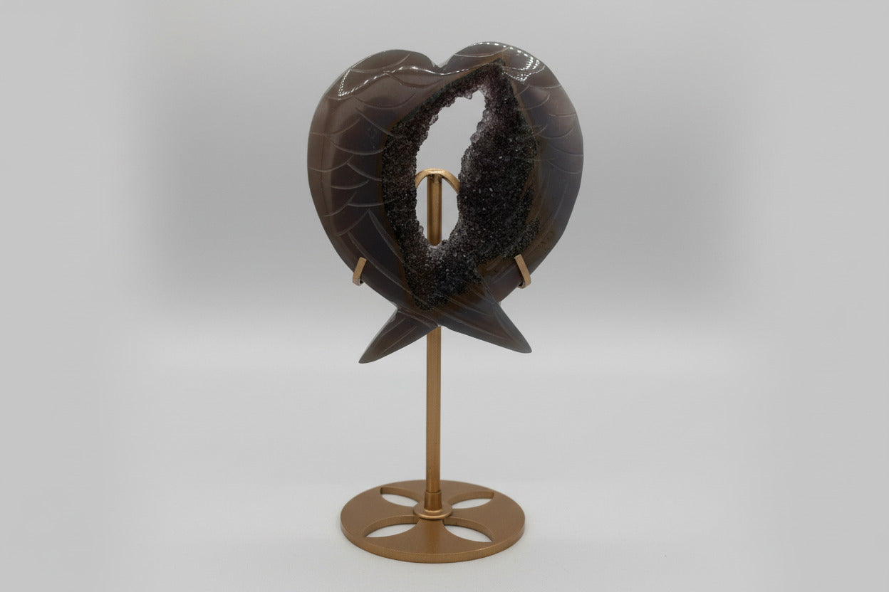 Elegant and symbolic, this natural Amethyst Agate carving features a beautifully sculpted heart with winged detailing, combining graceful design with the organic beauty of the stone. The natural banding and crystalline formations create a striking contrast that enhances its artistic and collectible appeal.