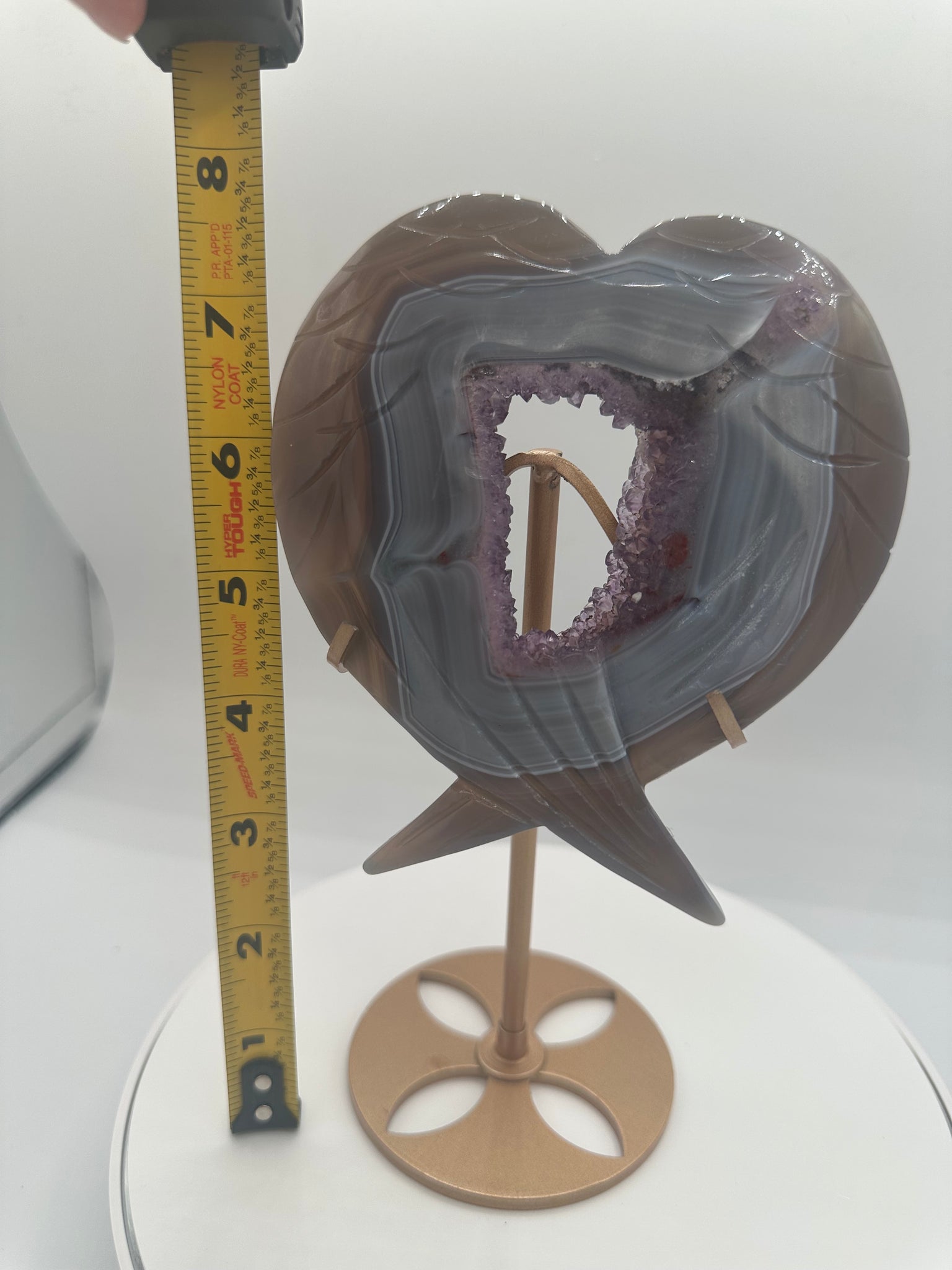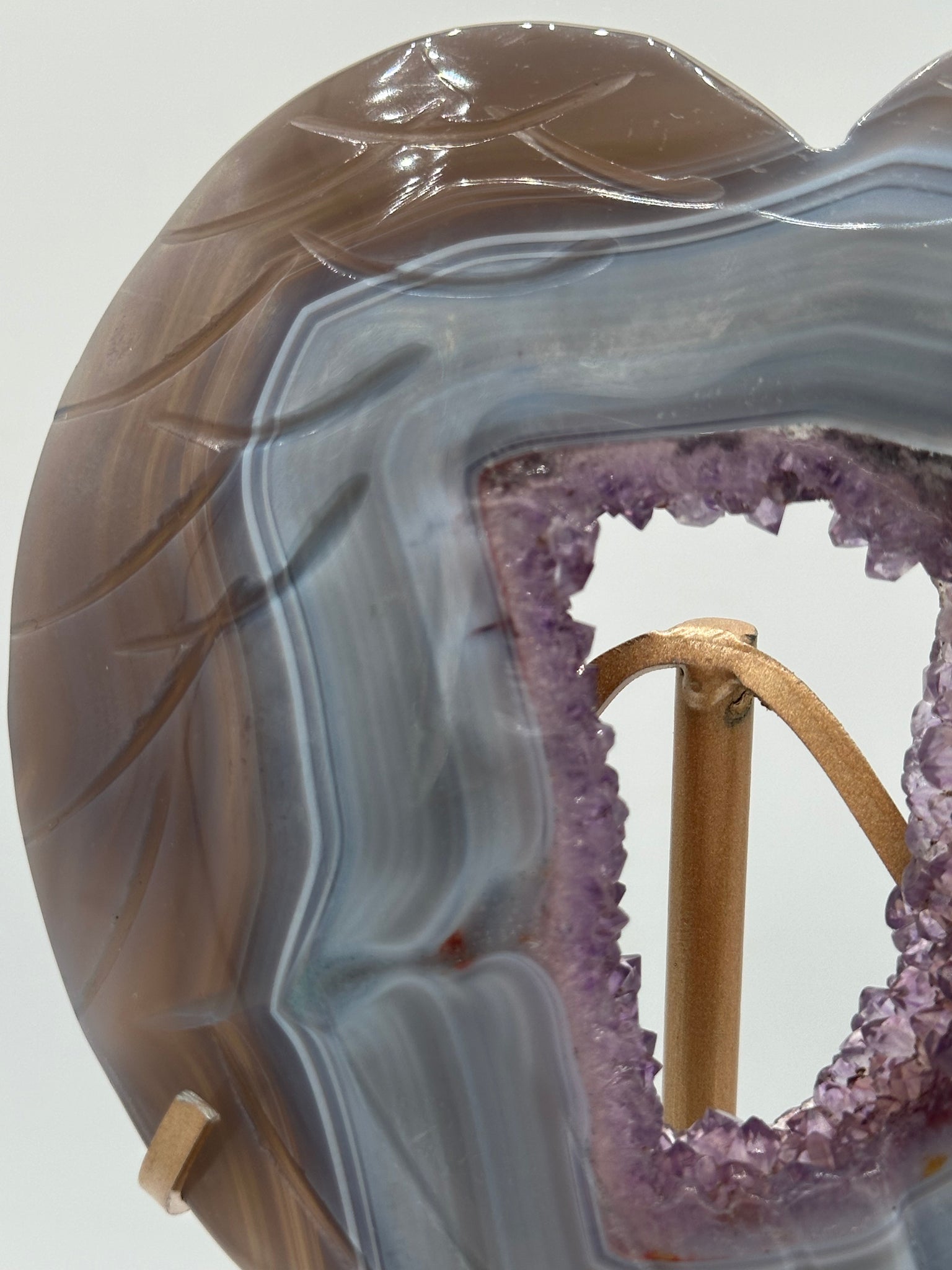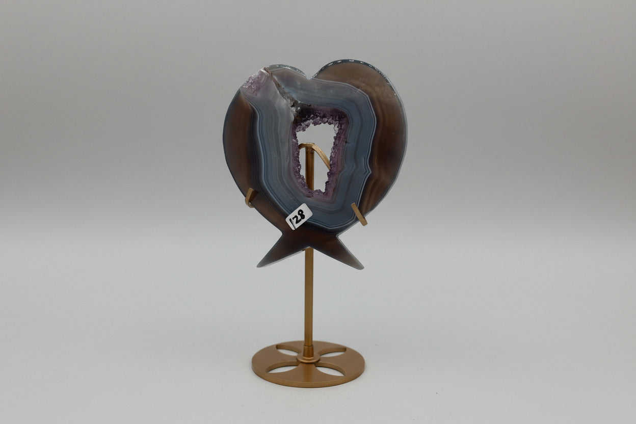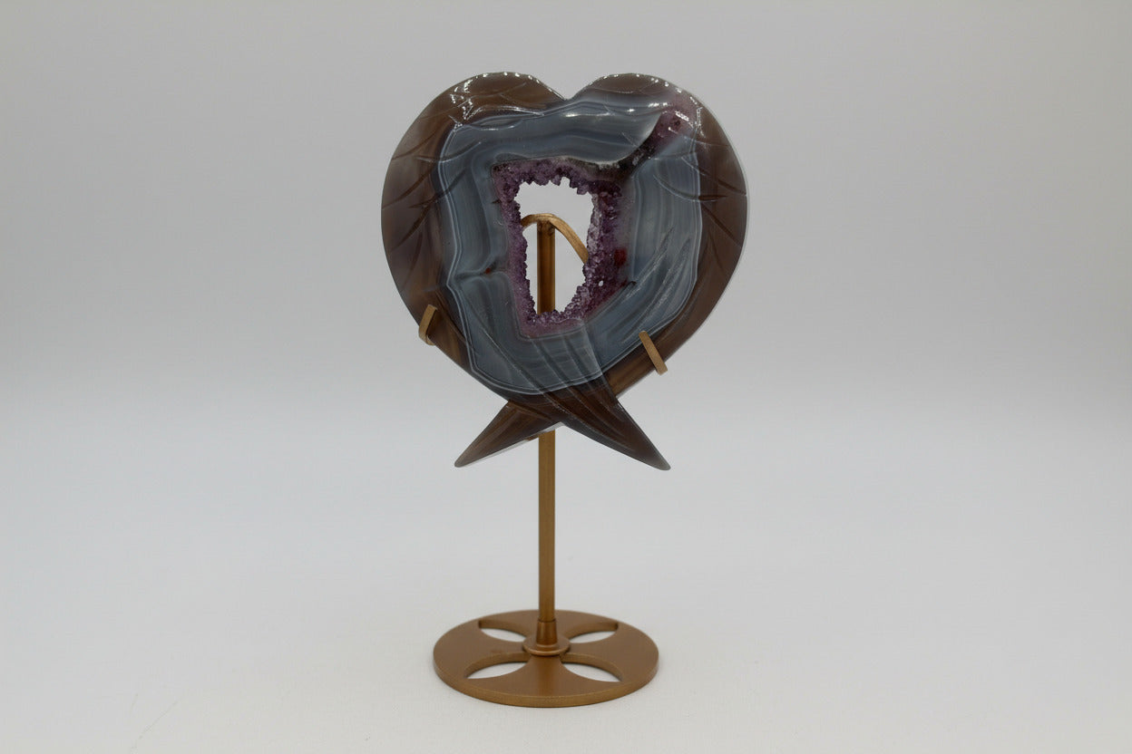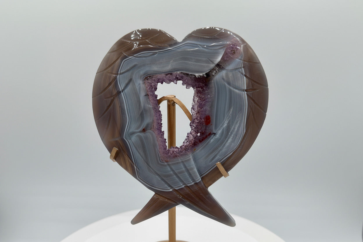 Elegant and symbolic, this natural Amethyst Agate carving features a beautifully sculpted heart with winged detailing, combining graceful design with the organic beauty of the stone. The natural banding and crystalline formations create a striking contrast that enhances its artistic and collectible appeal.