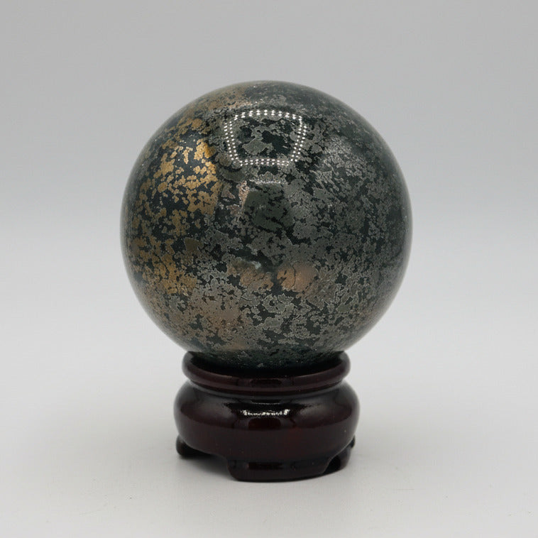 Add a touch of elegance and positive energy to your home decor with our Black Pyrite Sphere. Measuring at 62.89mm, this sphere boasts a unique and mesmerizing black pyrite color that will surely catch the eye. Perfect for meditation, this sphere is a must-have for anyone looking to enhance their spiritual practice.