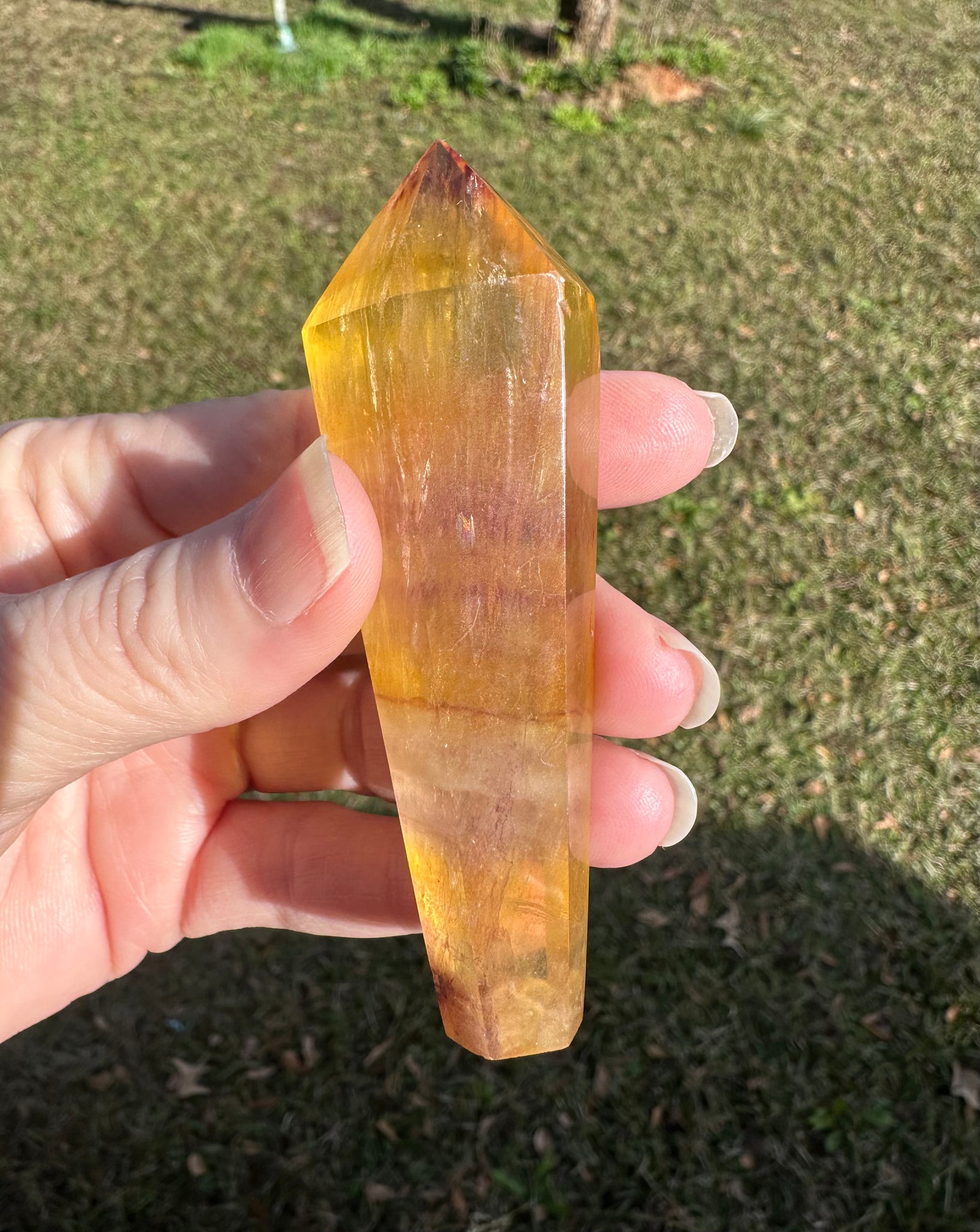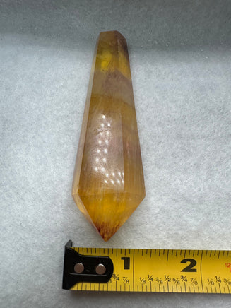 Expertly carved into a graceful scepter form, this piece highlights both the artistry of the carving and the natural beauty of fluorite. The polished finish enhances its vibrant color banding and clarity, while internal fractures create stunning rainbow reflections that add depth and visual intrigue.