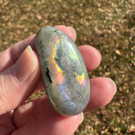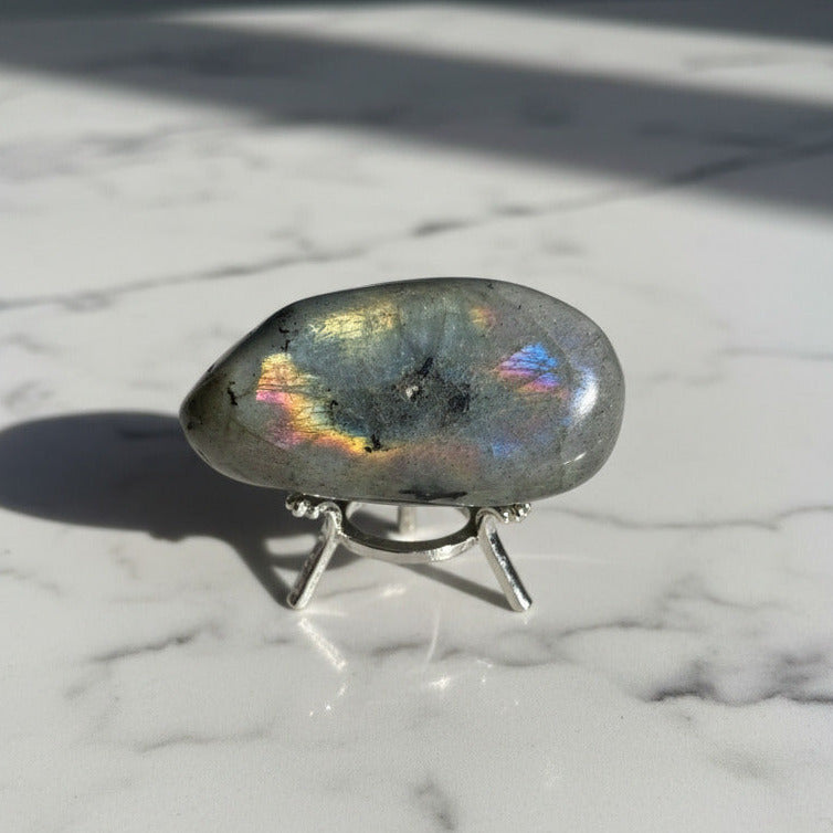 Discover the mesmerizing beauty of this Labradorite Palmstone, a perfect companion for your collection or daily carry. Labradorite is renowned for its stunning labradorescence—a magical play of iridescent blues, greens, and golden flashes that seem to dance across the stone's surface. Smooth and polished to perfection, this palm-sized piece fits naturally in your hand, making it ideal for meditation, energy work, or simply admiring its captivating optical effects. Labradorite is traditionally valued for promoting intuition and inner strength. Whether you're a seasoned collector or new to gemstones, this unique specimen offers both visual wonder and meaningful presence. Stand not included.