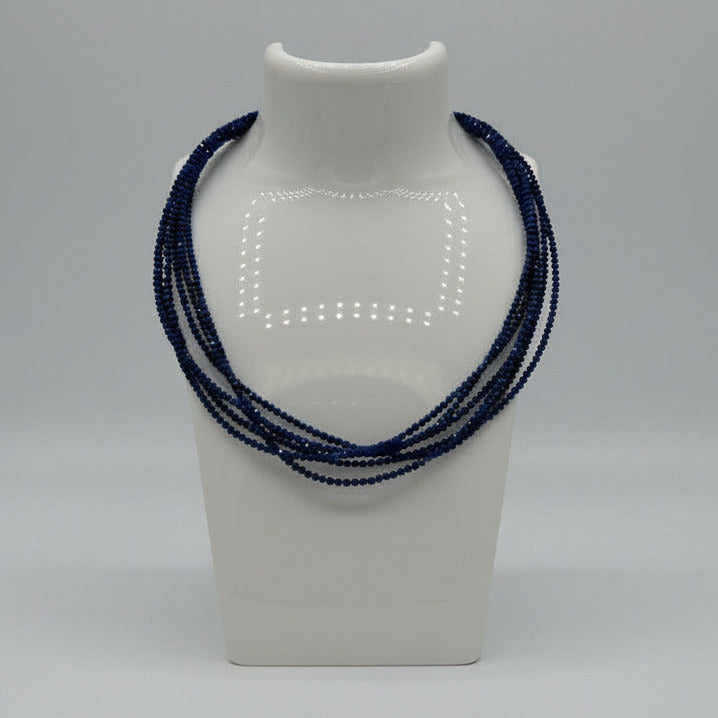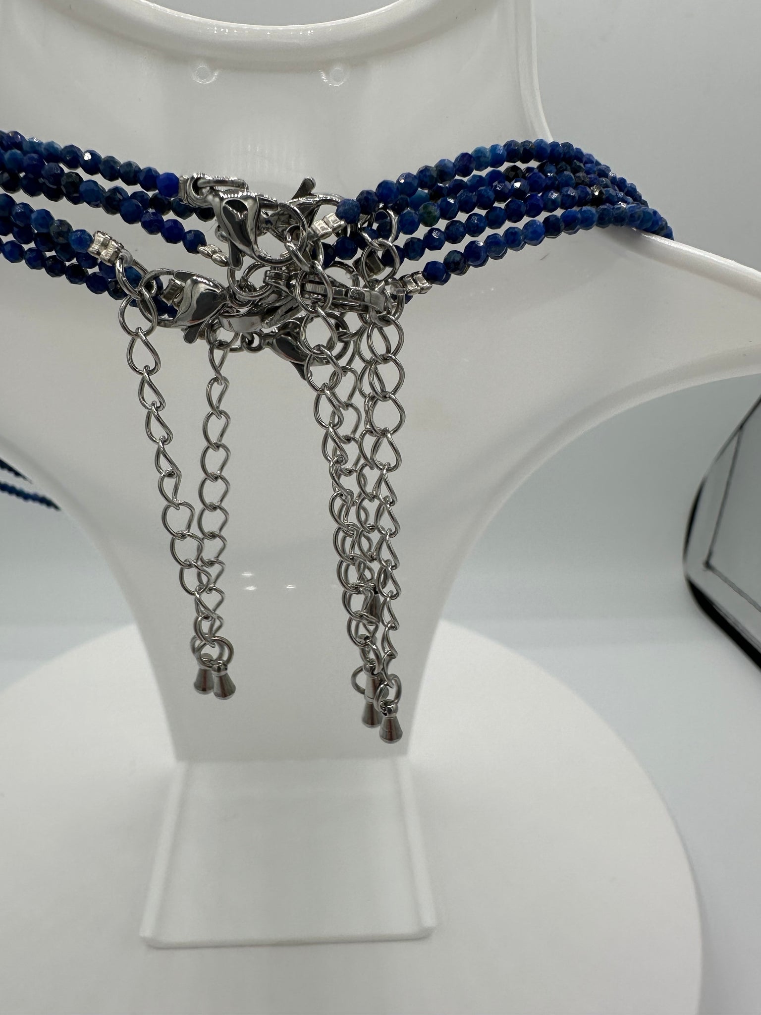 Natural 2mm Lapis Lazuli Faceted Necklaces feature stunning deep blue stones, each stone precisely cut to catch the light beautifully. This 16-inch necklace includes a convenient 2-inch extension, giving you flexibility to adjust the fit to your comfort. Secured with durable stainless steel clasps and extension hardware, this piece combines elegance with everyday wearability. Perfect for layering or wearing solo, lapis lazuli is treasured for its rich color and timeless appeal.