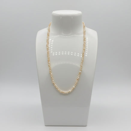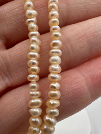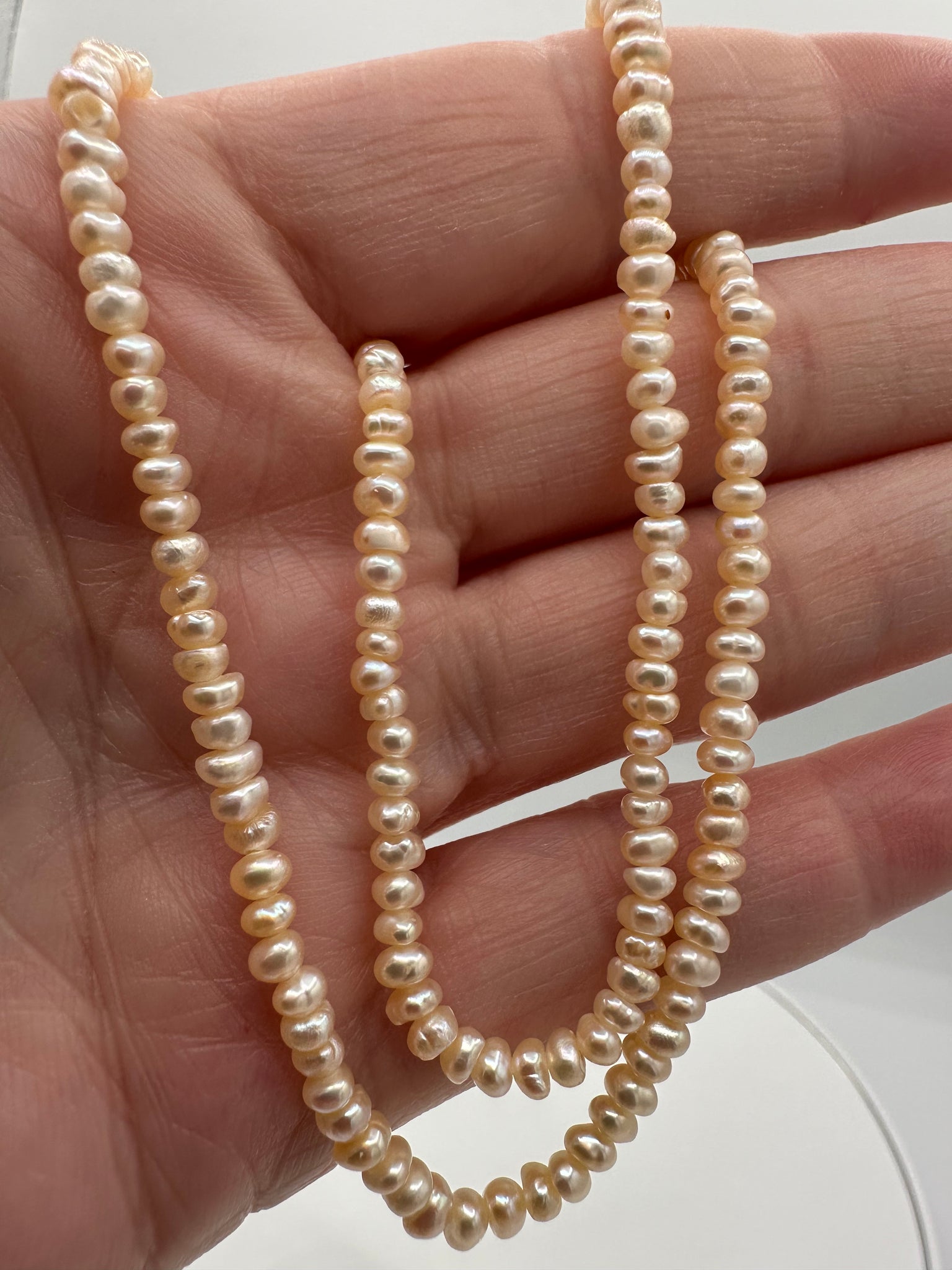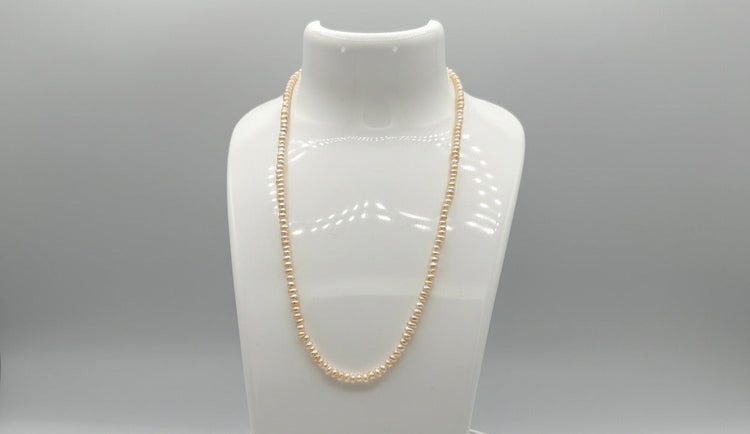 Soft and elegant, this natural Freshwater Pearl strand features a gentle peach tone with a warm, luminous glow. Each pearl displays smooth luster and organic shape, adding to its natural charm and individuality.