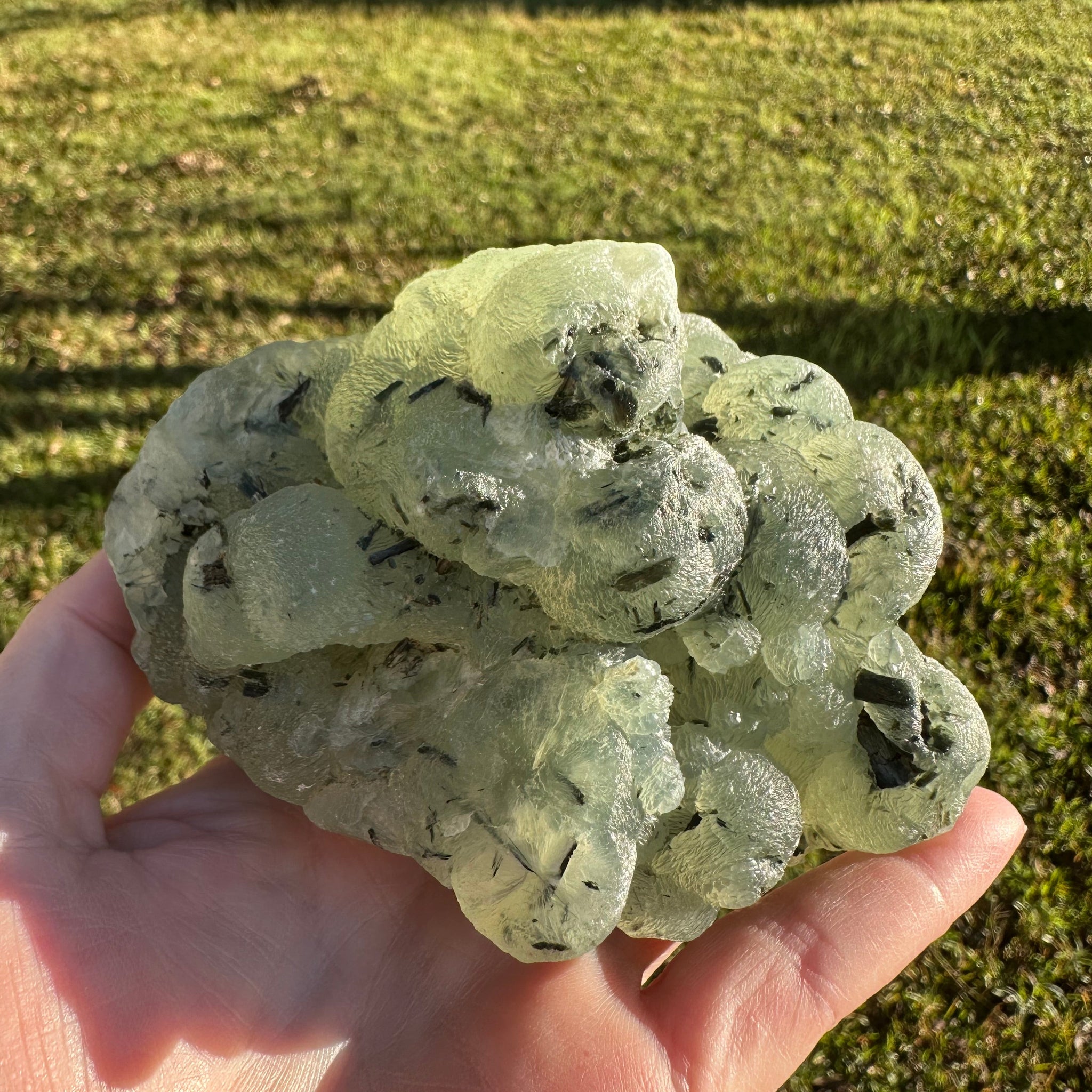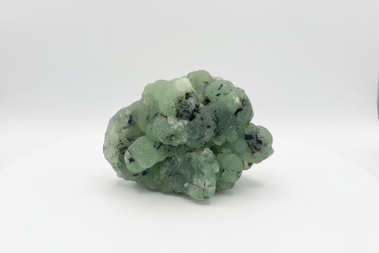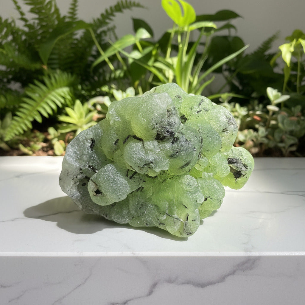 Discover the natural beauty of Prehnite mixed with Green Tourmaline in this stunning raw specimen. Each piece showcases unique formations, combining soothing green hues that bring a sense of calm and vitality to your space. Perfect for collectors or those seeking the energetic balance these stones provide, this specimen adds an earthy elegance to any collection or display. Embrace its natural charm and elevate your environment with a crystal that radiates both tranquility and strength. Stand not included.