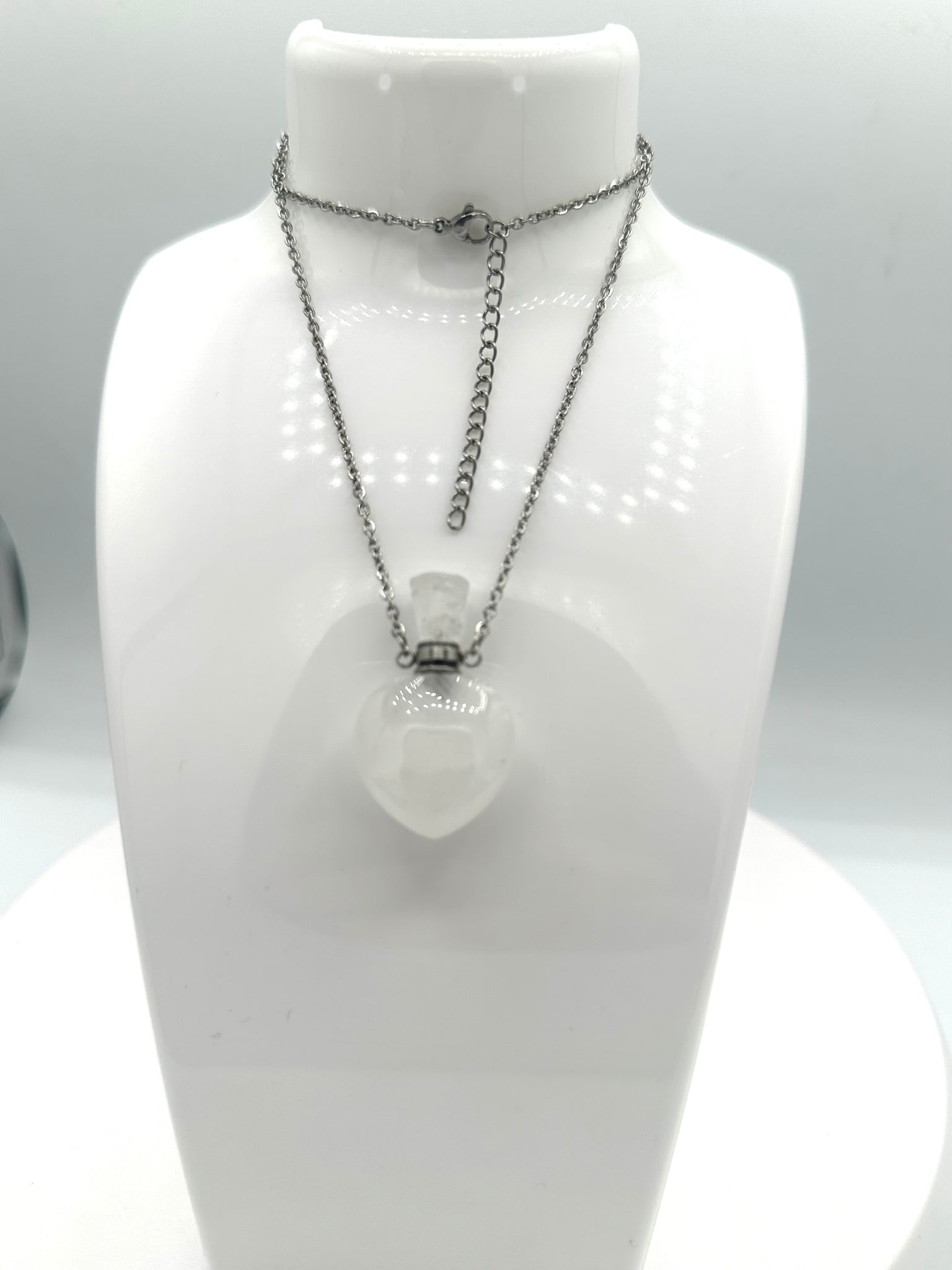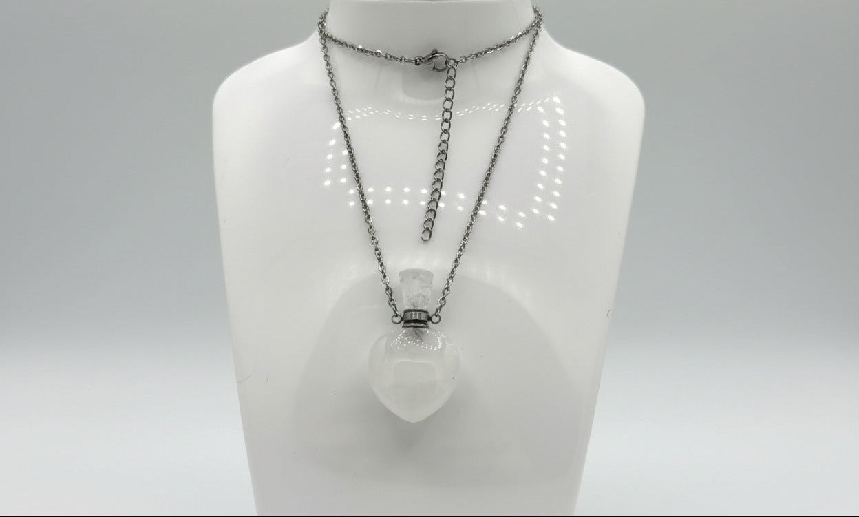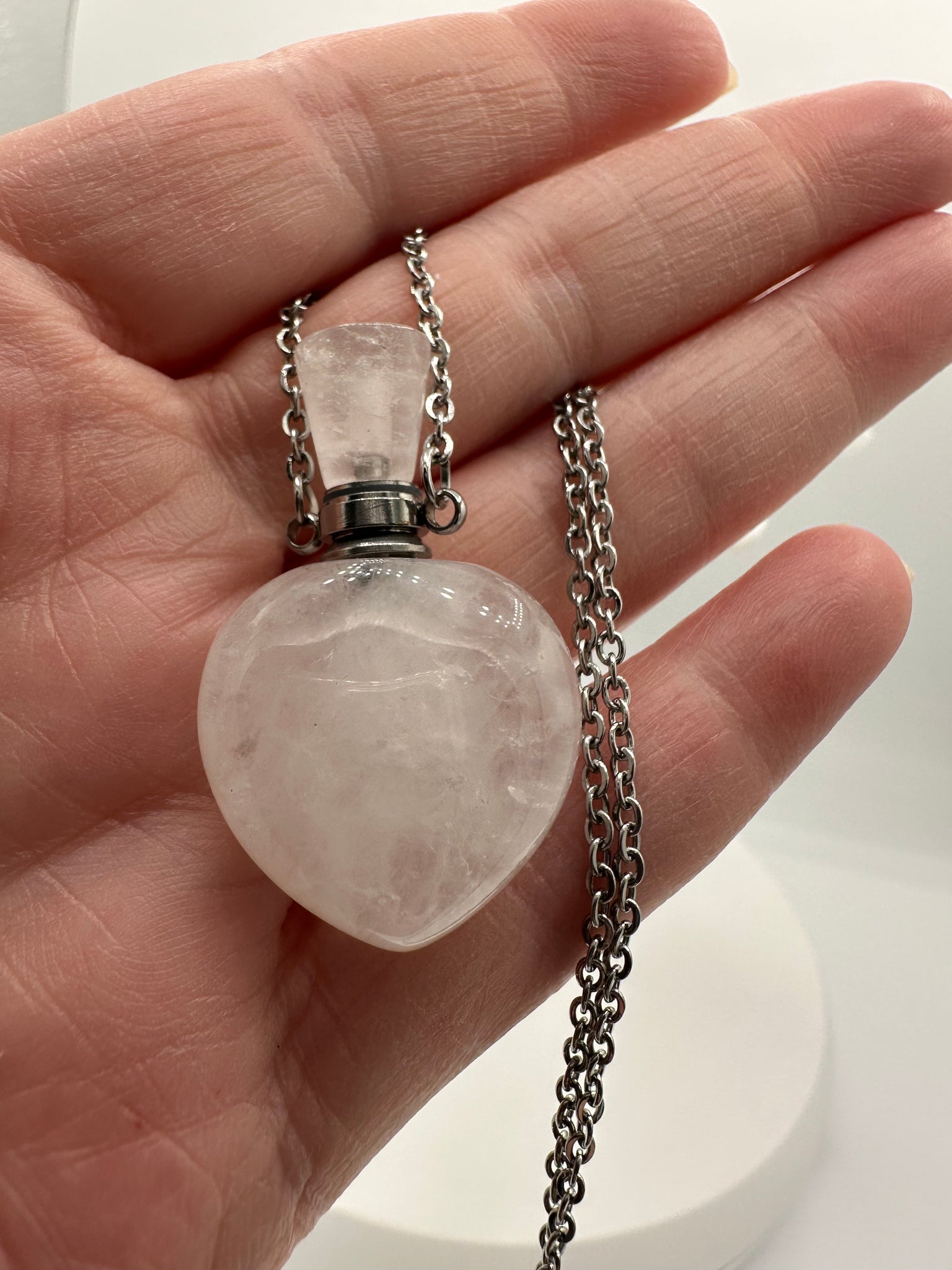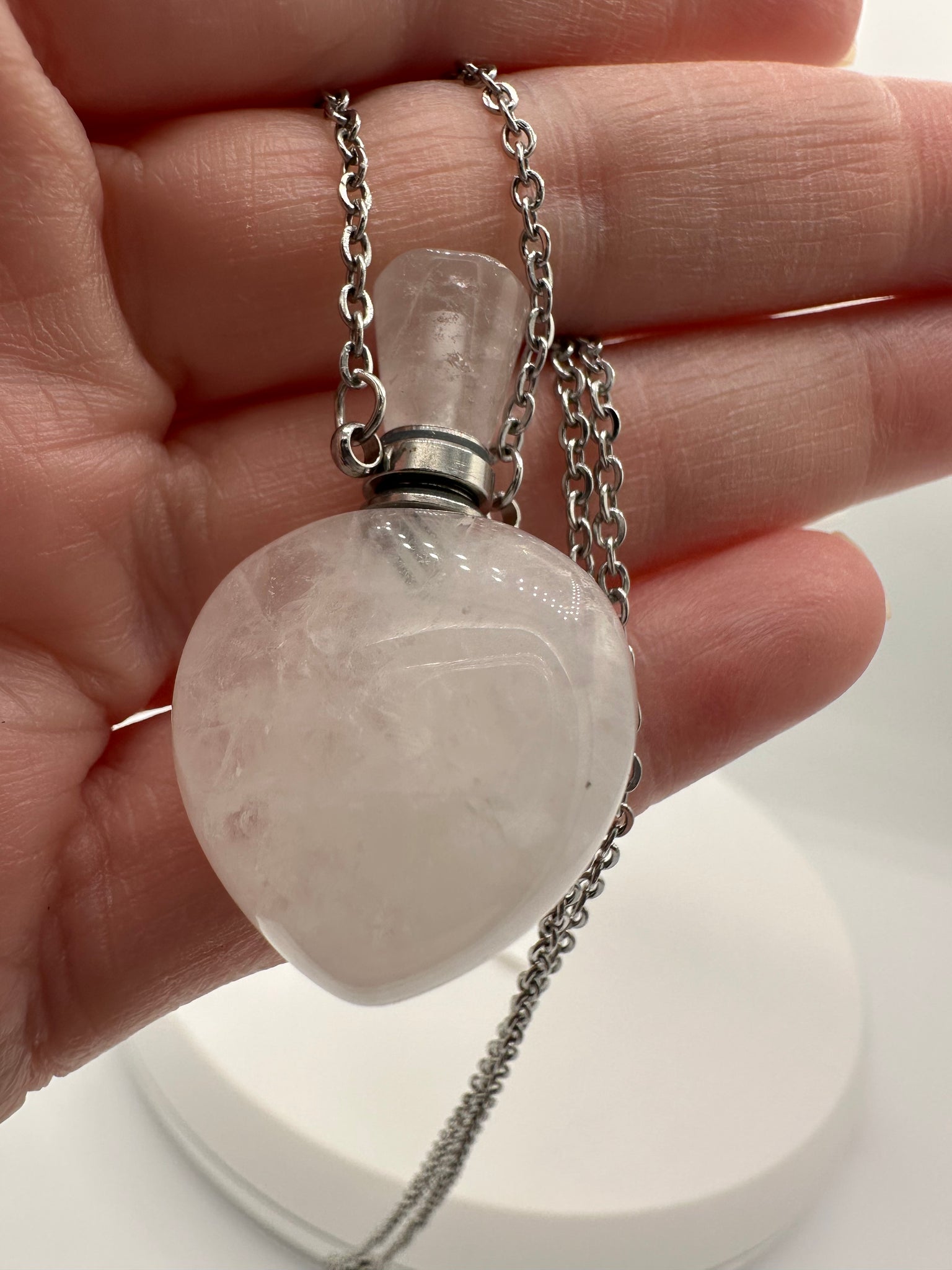 This beautiful Quartz perfume and essential oil bottle necklace blends natural crystal elegance with everyday functionality. The bottle is carved from clear quartz, showcasing its transparent to slightly milky appearance, often with subtle internal inclusions that reflect its natural origin.