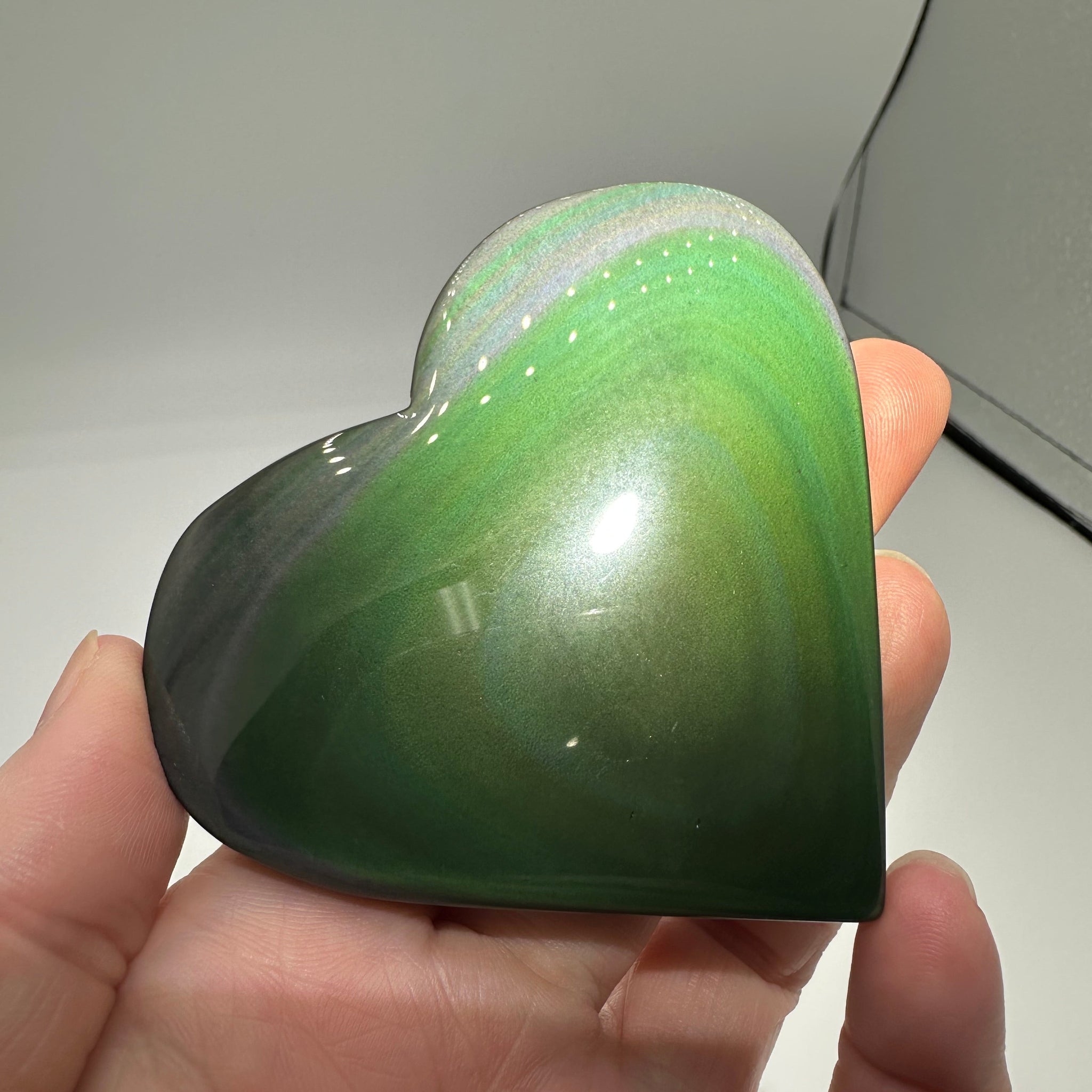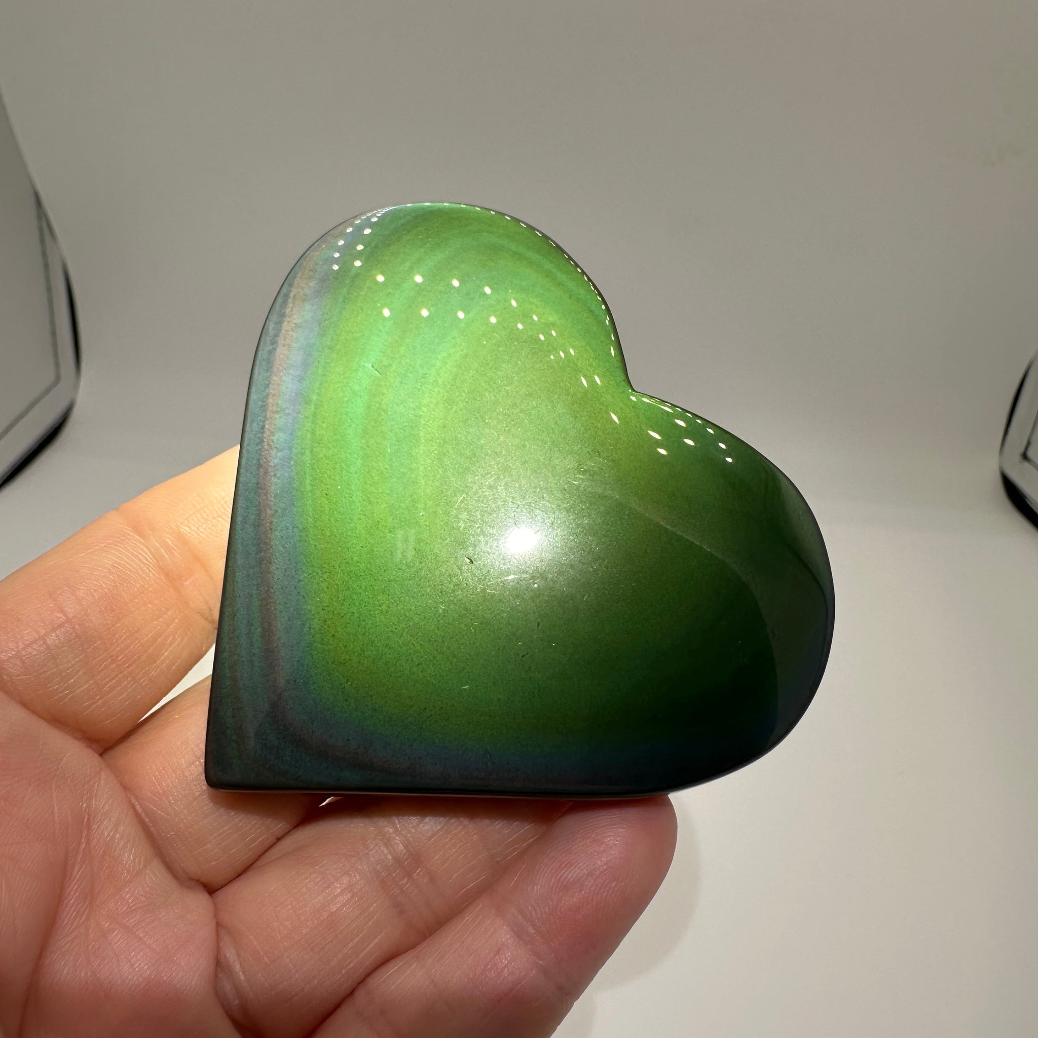 Discover the mesmerizing beauty of this Rainbow Sheen Obsidian Heart, a stunning natural gemstone that captures light with iridescent flashes of gold, green, and violet. Each piece is uniquely formed, showcasing the raw elegance of volcanic glass polished into a graceful heart shape. Perfect for collectors, crystal enthusiasts, or anyone seeking a meaningful decorative accent, this obsidian heart radiates protective energy while adding sophisticated natural beauty to any space. A truly one-of-a-kind treasure that celebrates nature's artistry.