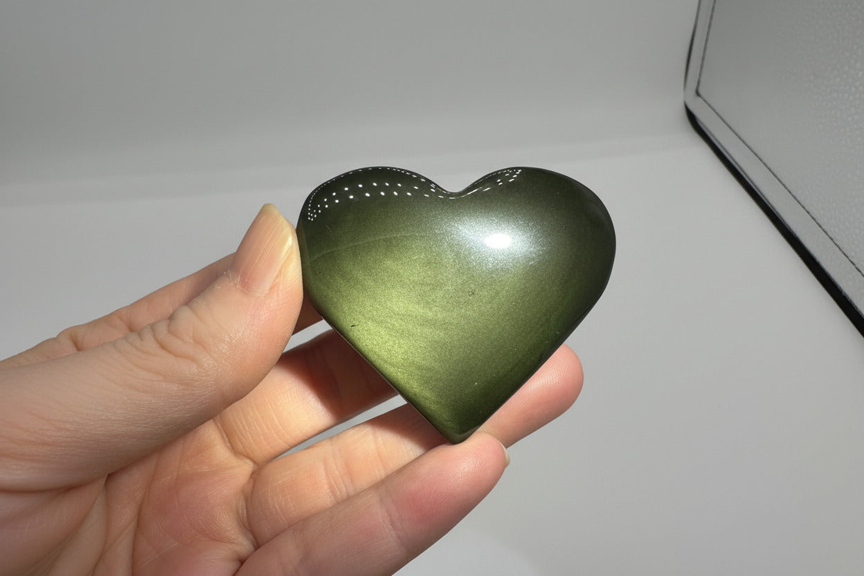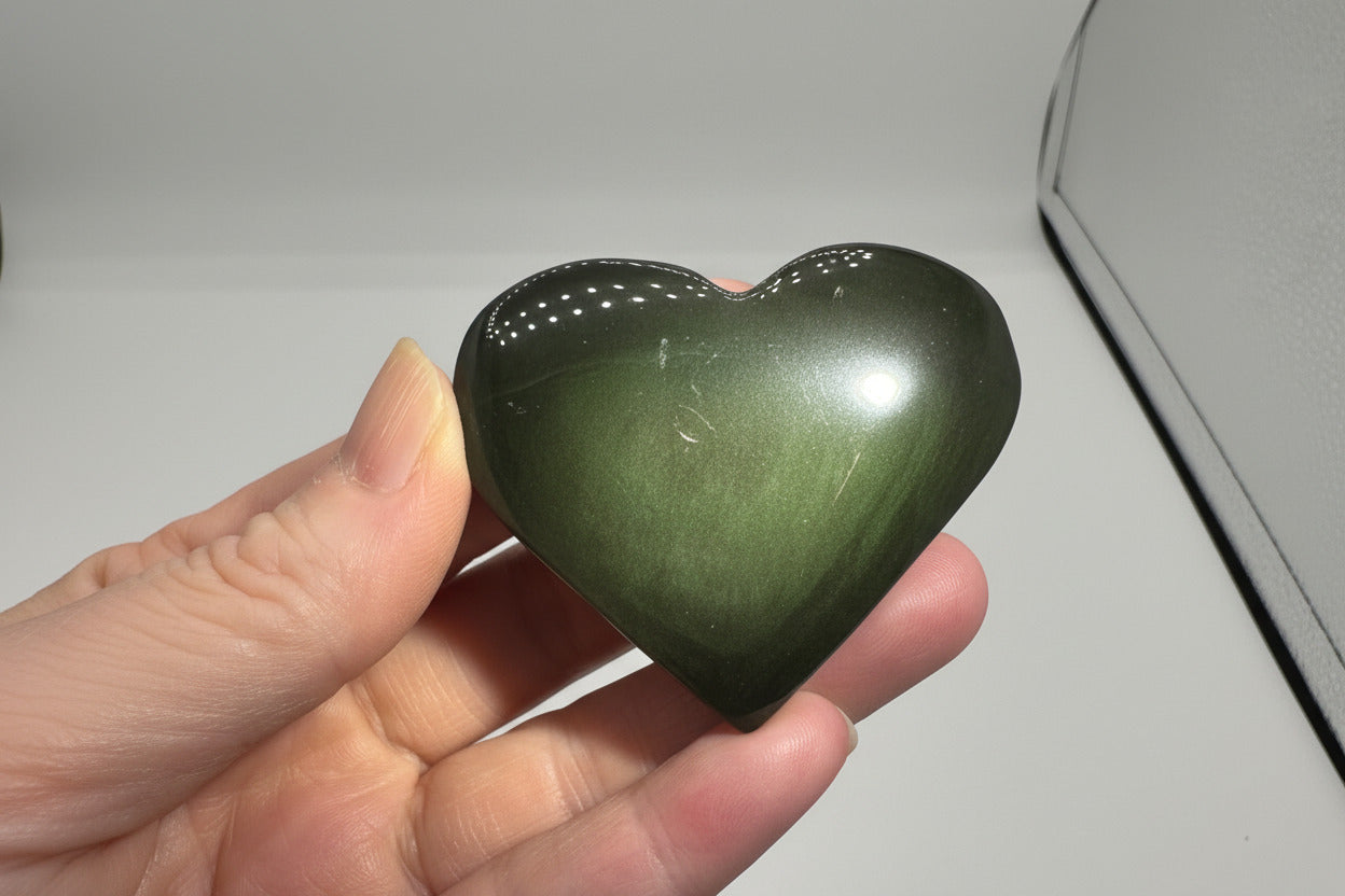 Discover the mesmerizing beauty of this Rainbow Sheen Obsidian Heart, a stunning natural gemstone that captures light with iridescent flashes of gold, green, and violet. Each piece is uniquely formed, showcasing the raw elegance of volcanic glass polished into a graceful heart shape. Perfect for collectors, crystal enthusiasts, or anyone seeking a meaningful decorative accent, this obsidian heart radiates protective energy while adding sophisticated natural beauty to any space. A truly one-of-a-kind treasure that celebrates nature's artistry.