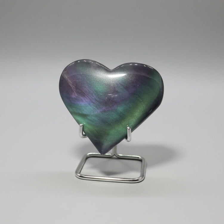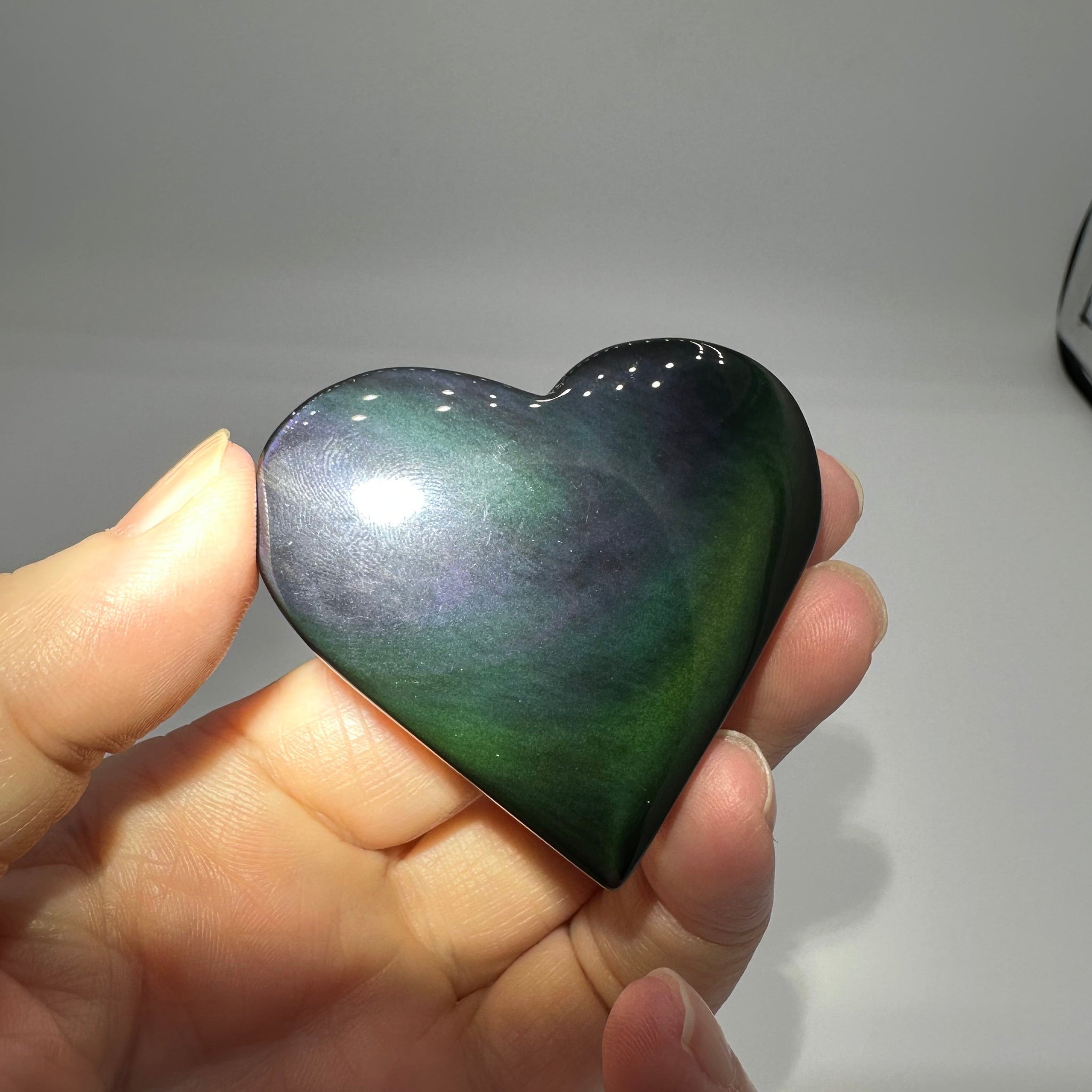 Discover the mesmerizing beauty of this Rainbow Sheen Obsidian Heart, a stunning natural gemstone that captures light with iridescent flashes of gold, green, and violet. Each piece is uniquely formed, showcasing the raw elegance of volcanic glass polished into a graceful heart shape. Perfect for collectors, crystal enthusiasts, or anyone seeking a meaningful decorative accent, this obsidian heart radiates protective energy while adding sophisticated natural beauty to any space. A truly one-of-a-kind treasure that celebrates nature's artistry.